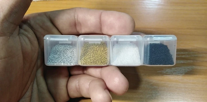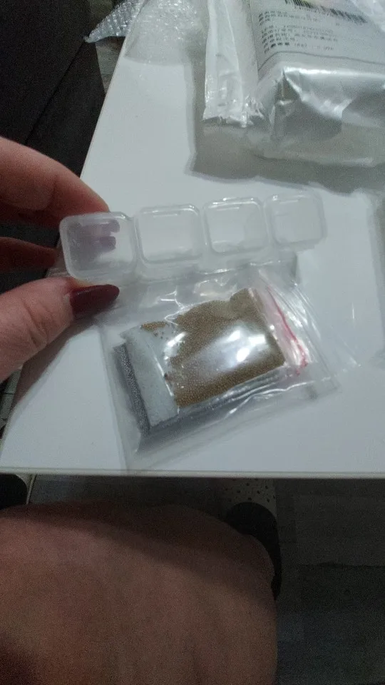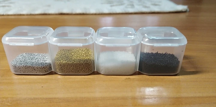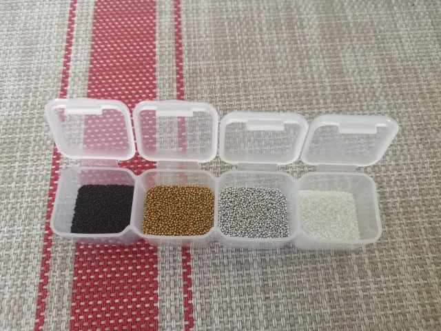 Товар доставили за 21 день до отделения почты. Трэк номер отслеживался (совмещенная доставка от 3 продавцов). Контейнер и бульонки упакованы раздельно. Пересыпать следует осторожно, "скачут" и норовят убежать в другом направлении . Меньше всего белого цвета, на фото видно. Больше всего серебра и золота, чёрного чуть меньше.