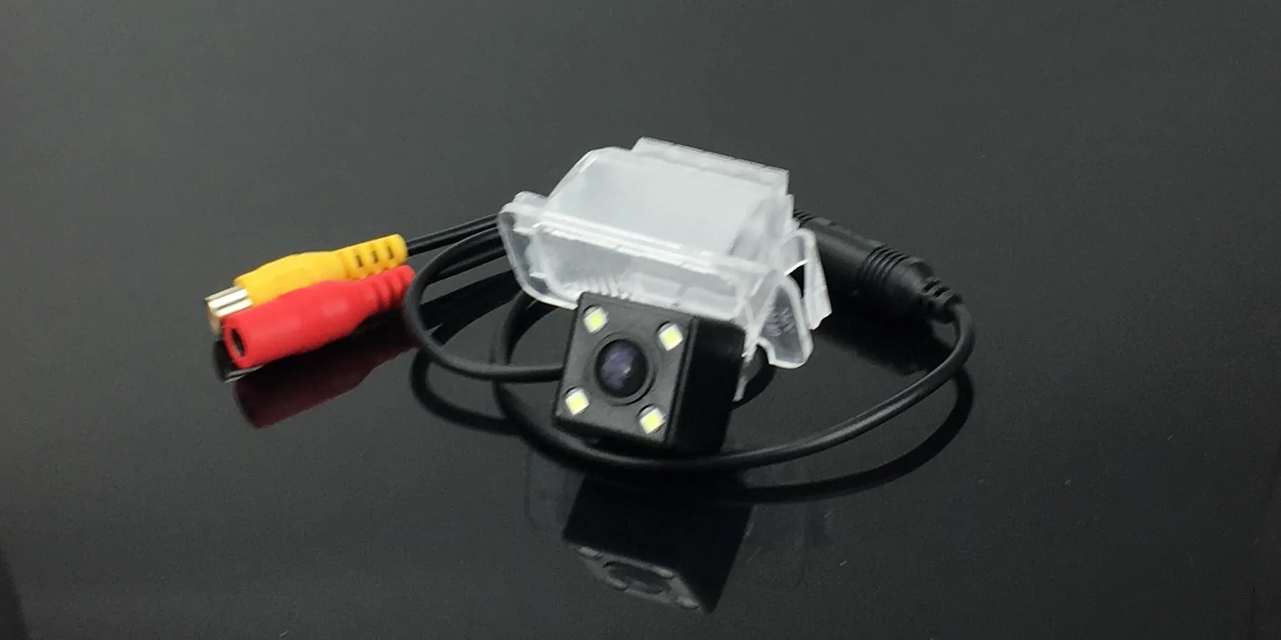 . Прикрепите камеру к стандартному светильник ному знаку.. Подключите встроенный светильник номерного знака камеры к тому месту, где был подключен штатный светильник номерного знака, чтобы получить питание. Подключите питание камеры к стоп-сигналам-красный провод к положительному, а черный-к отрицательному.. Подключите видеокабель камеры к удлинителю.