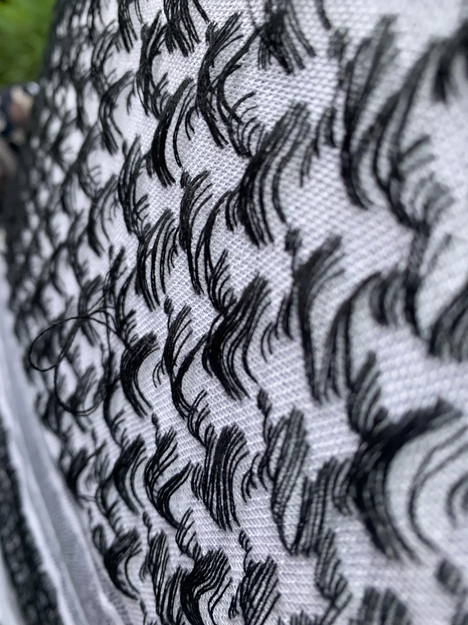Нитки черной вышивки тонкие и очень легко вытягиваются при малейшем воздействии. сама ткань достаточно качественная, приятная.