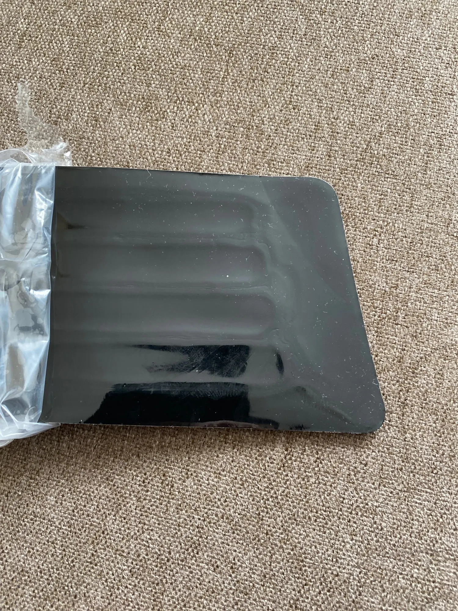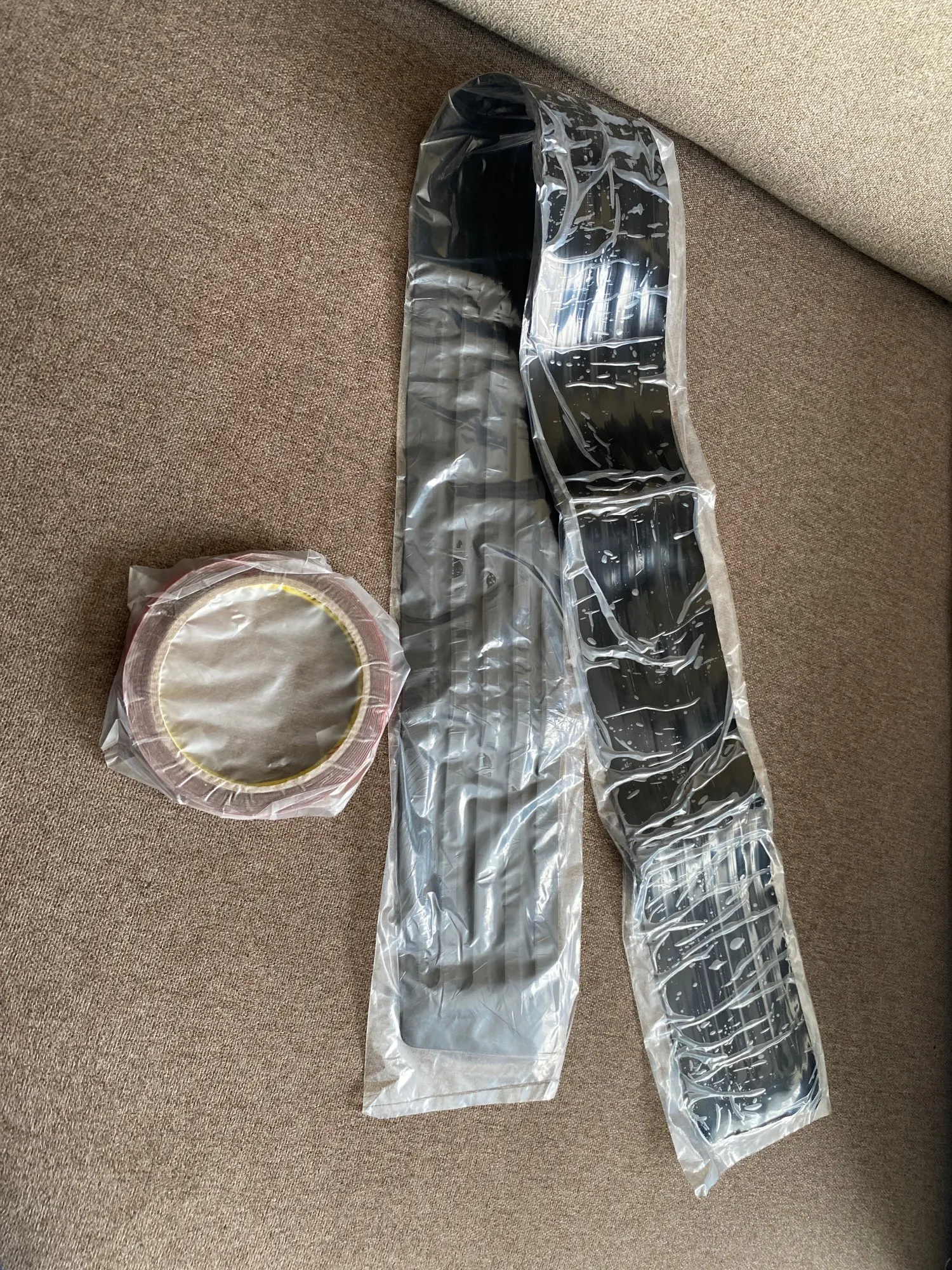 Посылка пришла быстро, упакована хорошо. Накладка выполнена из резины, на ощупь и внешний вид качество отличное. Без посторонних запахов. Толщина накладки около 2-3 мм. В комплекте скотч 3M.