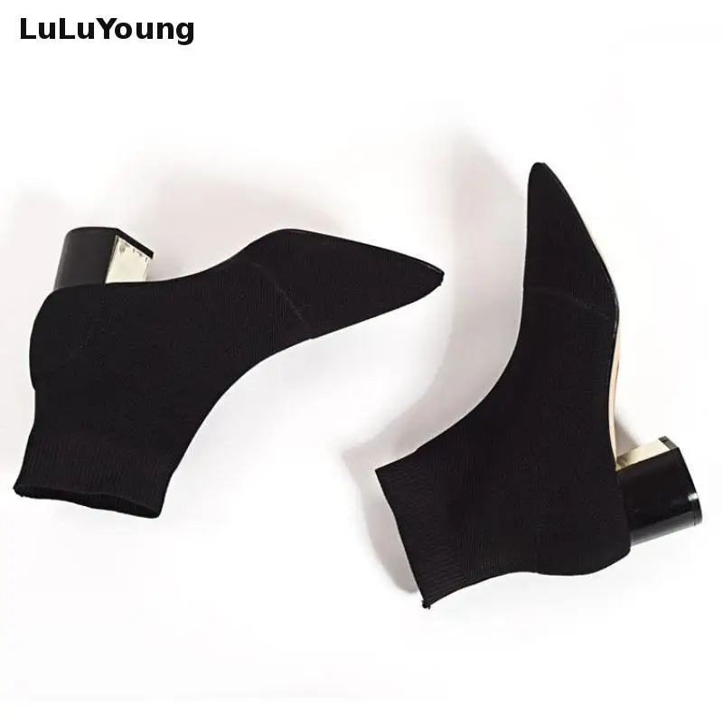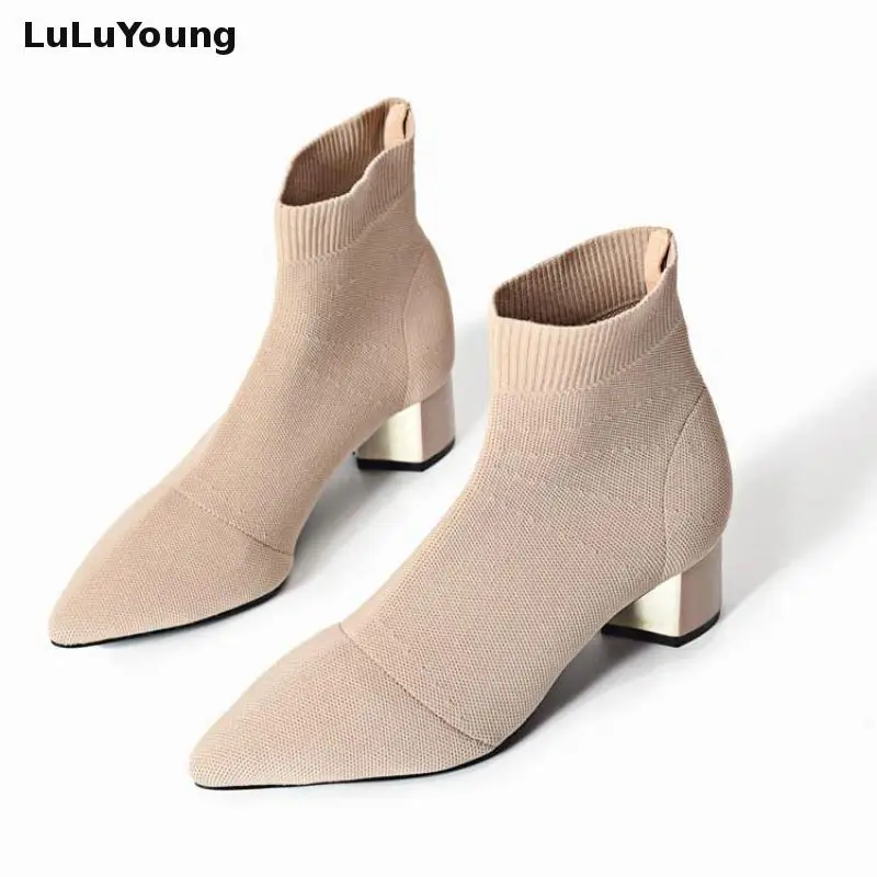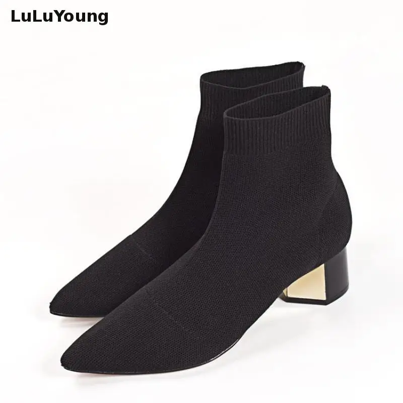 Вязаные эластичные ботинки-носки, короткие ботинки на среднем каблуке, женские ботильоны с острым носком