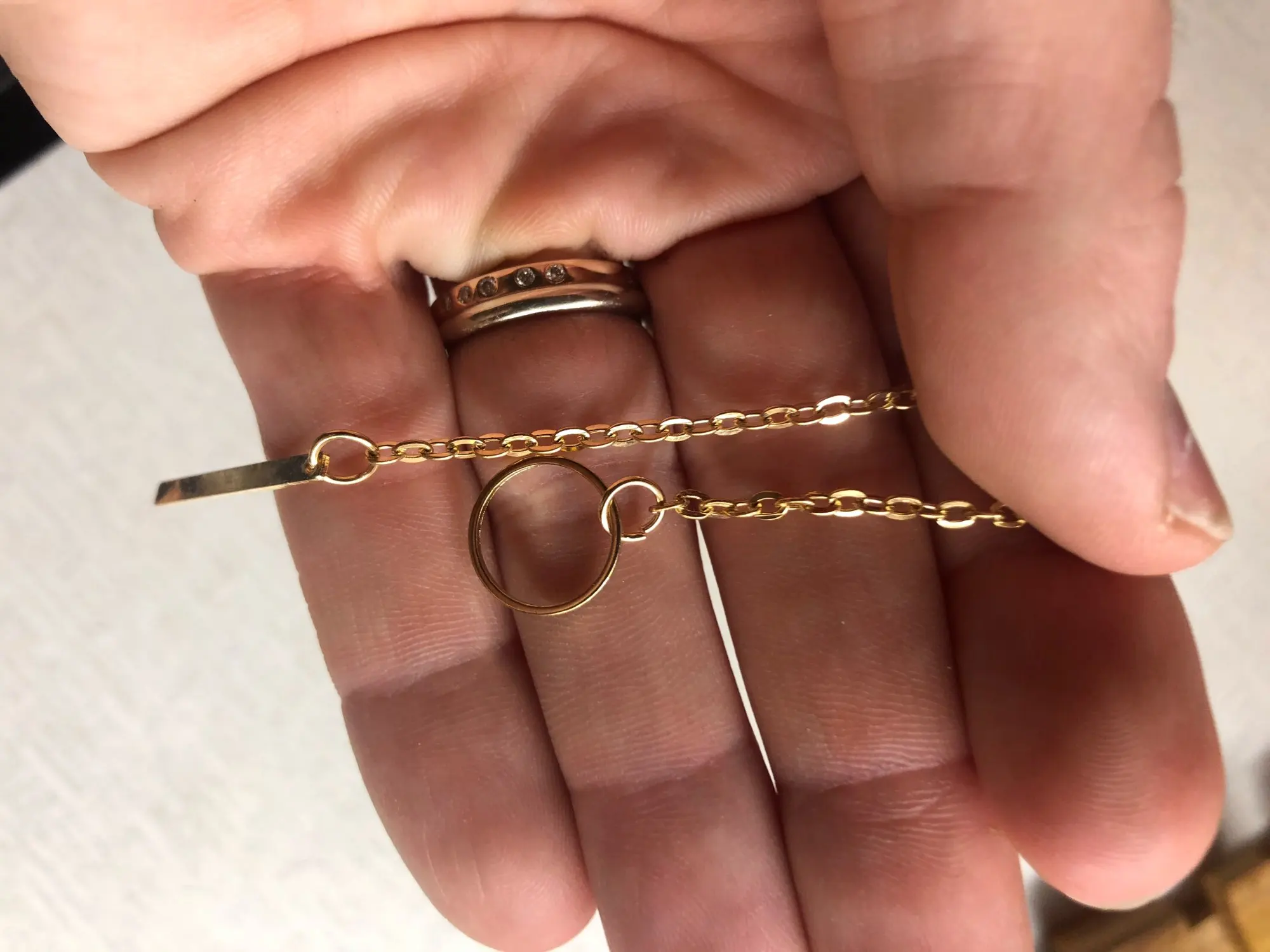 Ожерелье в точности как на фотографиях. Он не выглядит слабым и не чувствует себя слабым, кажется устойчивым к ежедневному использованию. Это удобно. Его цвет абсолютно не Золотой, он Золотой, а с определенным медным тоном. Он также выглядит очень мило, когда его надевают, и его легко адаптировать к размеру, который вы хотите оставить, потому что он скользит. Мне очень понравился продукт. Я рекомендую продавца, потому что он отправил очень быстро.
