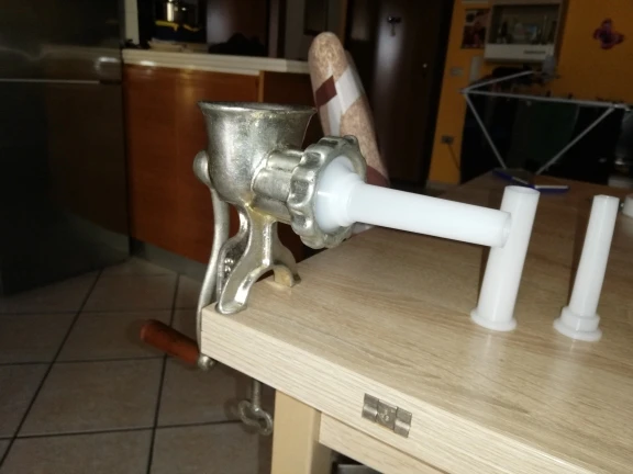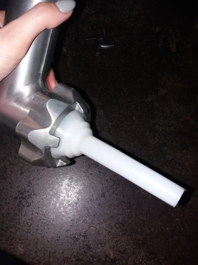 отличный набор для мясорубки, самая тоненькая насадка немного гуляет под кольцом фиксатором, но если аккуратно зафиксировать под кольцом мясорубки то норм... фарш надо прокрутить в блендере и потом раскатать скалкой в ёмкости в пищевой пленке, что бы он не был рыхлым, тогда и сосиски получаются плотные....