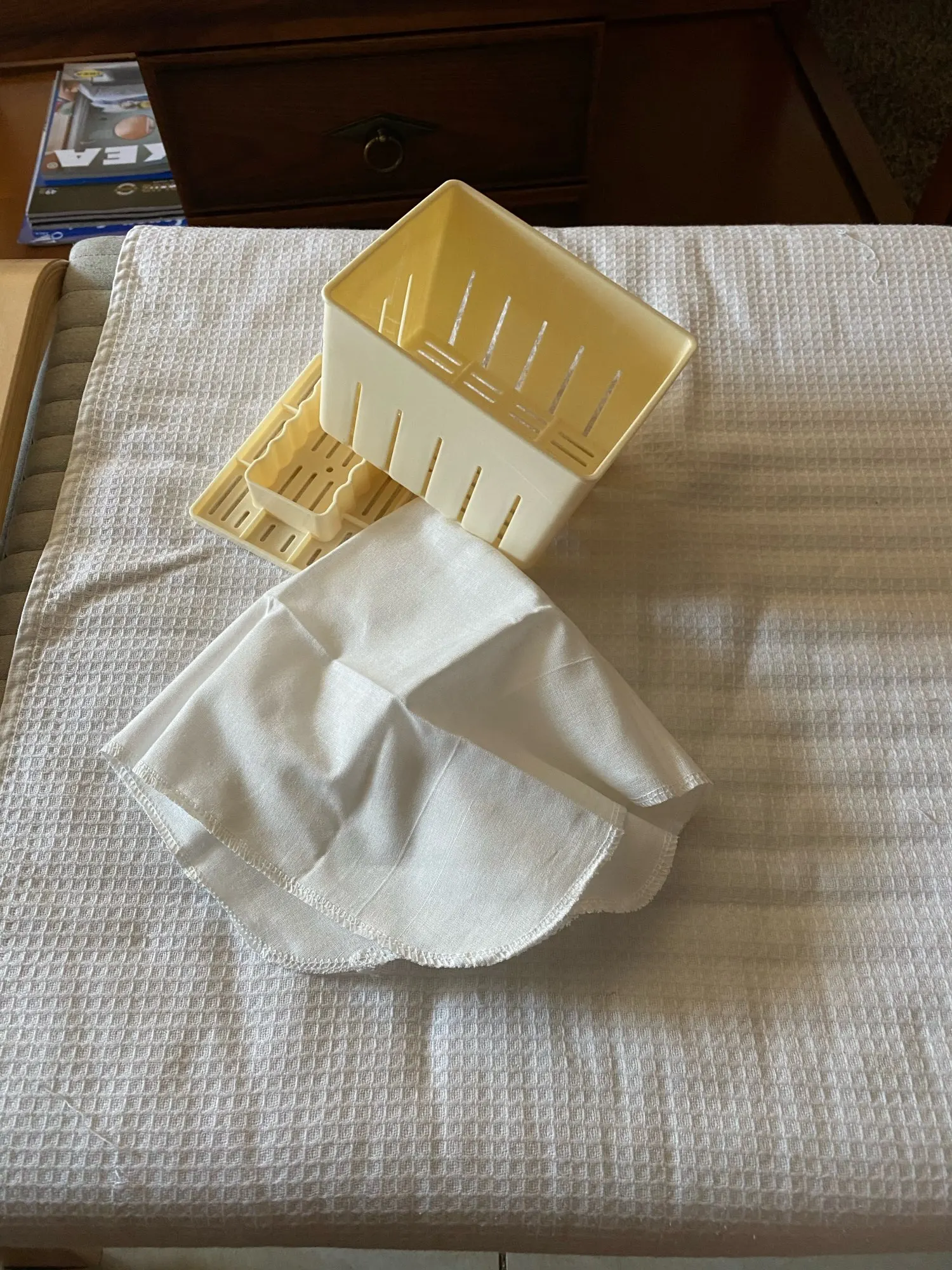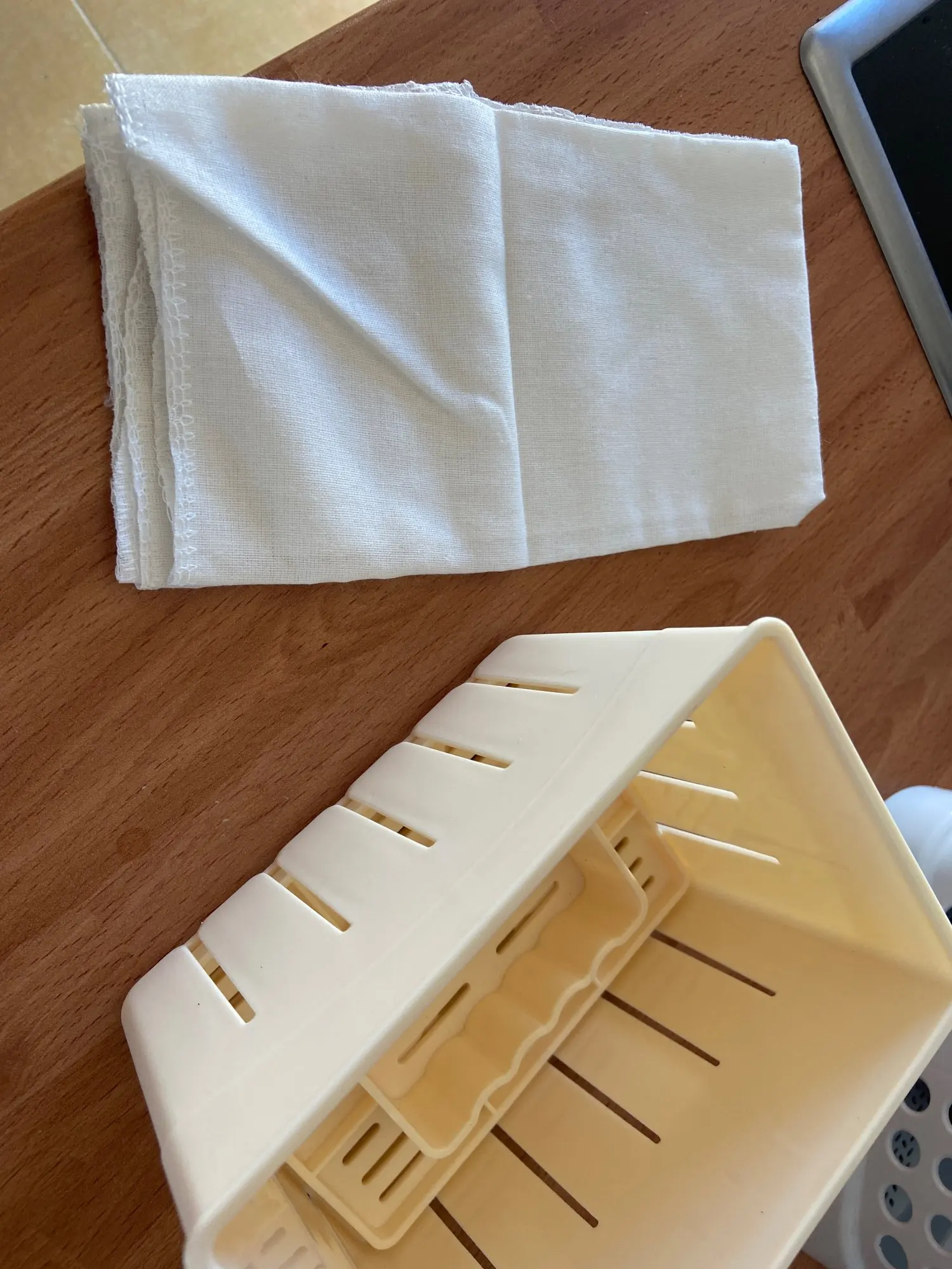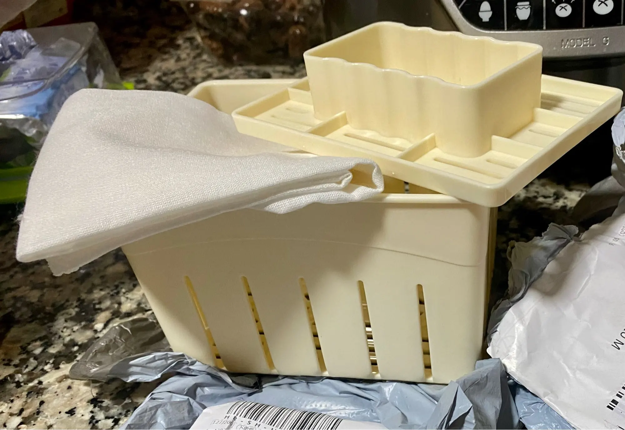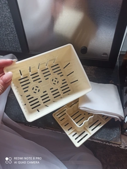 Lo he usado para hacer queso fresco y ha salido bien, aunque se le manchan los dos círculos del fondo del recipiente jeje Quizás la tapa podría ajustar un poco más. Viene con una tela que aún no he probado. Llegó rápido.