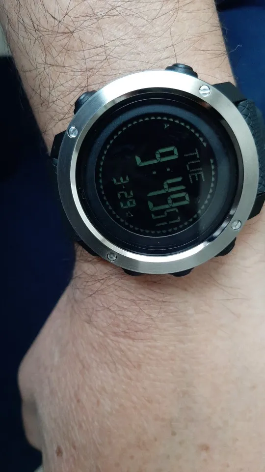 Часы прибыли очень быстро! Красиво и хорошего качества. Отвечает описанным функциям, но имеет проблемы. Здесь, где находится Brasilia, давление и температура очень отличаются, чем по умолчанию. При этом нельзя регулировать давление и высоту. Можно настроить только. Чтобы поставить правильное давление, например, установка высоты ограничена, прежде чем получить правильное значение, такова разница между обнаруженным здесь, где живёт, и тем, что должно быть по умолчанию. Из-за этого можно использовать только давление или высоту. К сожалению, вы не можете настроить два. Не должно быть ограничений по размеру.
