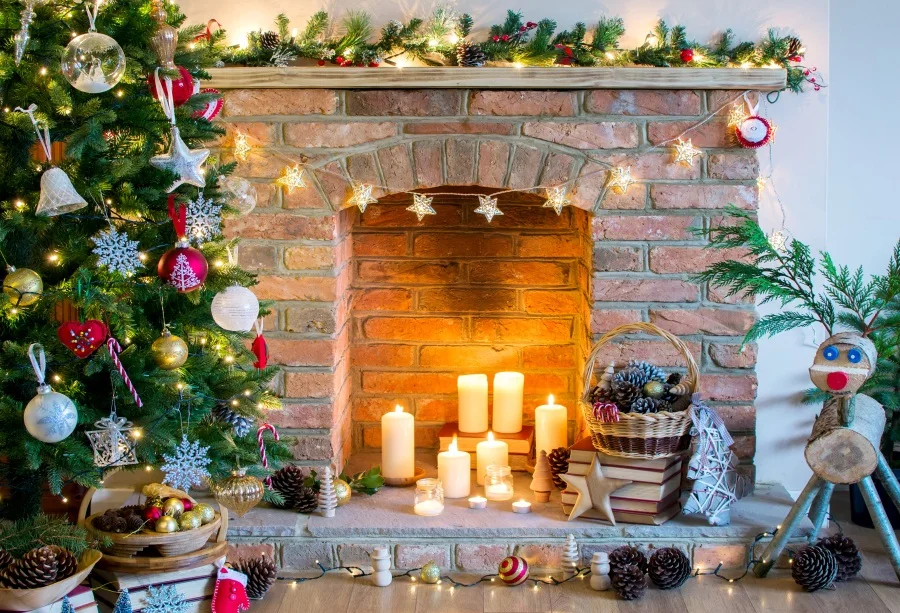 Laeacco Рождественская декорация, подсвечник колокольчик, безделушка, звезда, венок, кирпич, камин, детский Фотофон, фотосессия Фотостудия