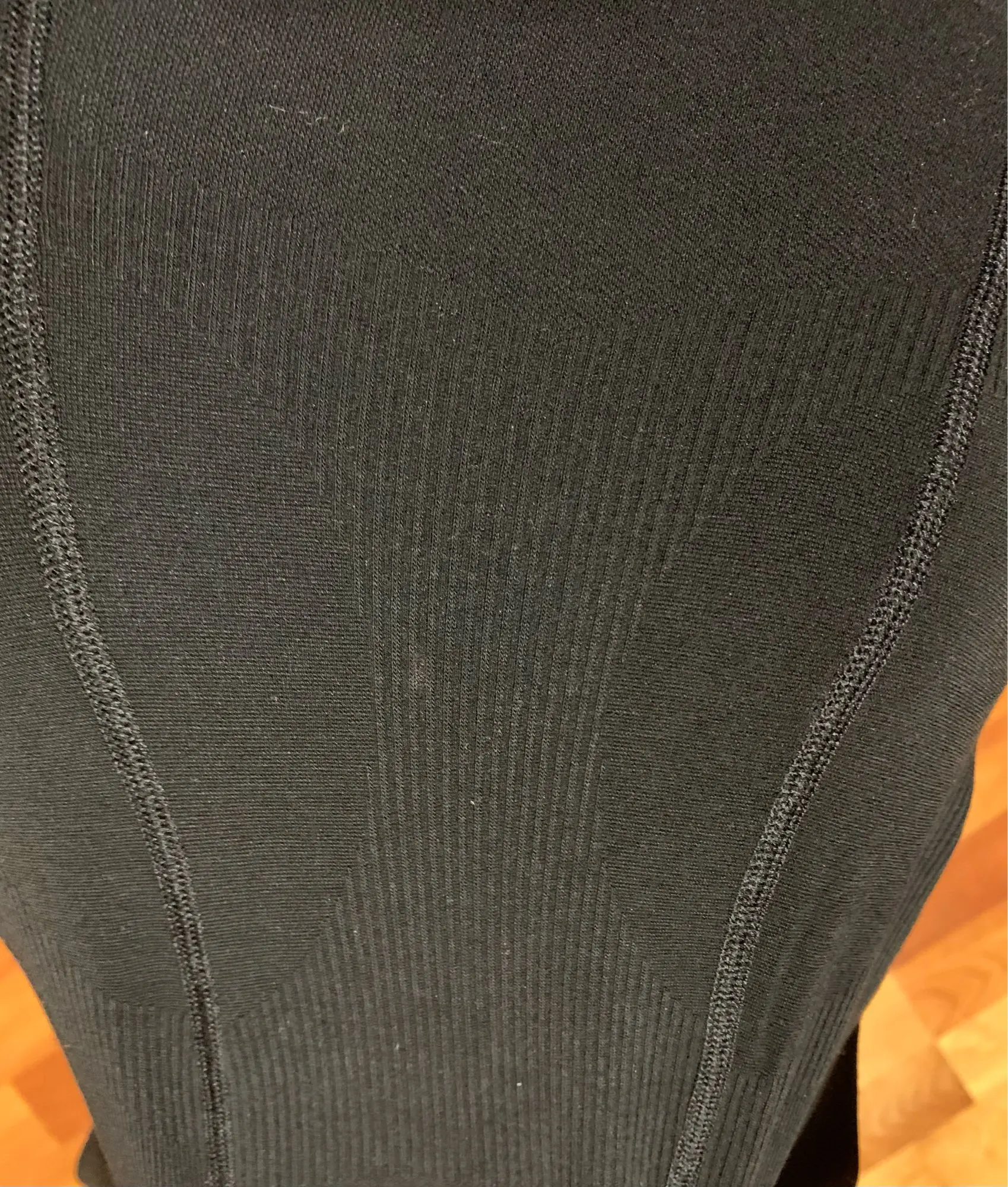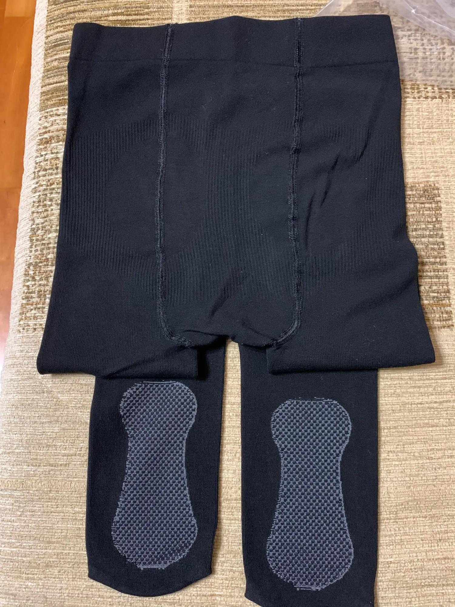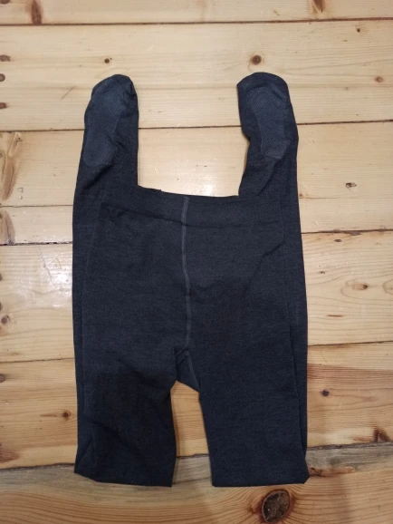 Очень хорошие колготки, плотные, но они не теплые и не похожи на то, что в составе есть шерсть или х/б, полностью синтетика. В ширину тянутся, но очень тугие, впечатление как в компрессионных чулках. Чтобы растянуть, надо сильно постараться (на последнем фото с силой натягивала на костяшки пальцев. Сзади два шва и усиленный рубчик с окружностями для поднятия ягодиц, спереди такой же рубчик должен утягивать живот, но по мои ощущениям "утяжки" на животе/бедрах вообще нет, даже не сравнится с утяжкой по длине ноги. На стопе - следок для анти-скольжения, но он коротенький, около 12 см, на европейской ноге скорее работает индикатором стопы. Пошив очень аккуратный, шва ровные, вязка гладкая, рубчик на ноге не видно от слова совсем, просто гладенькие.