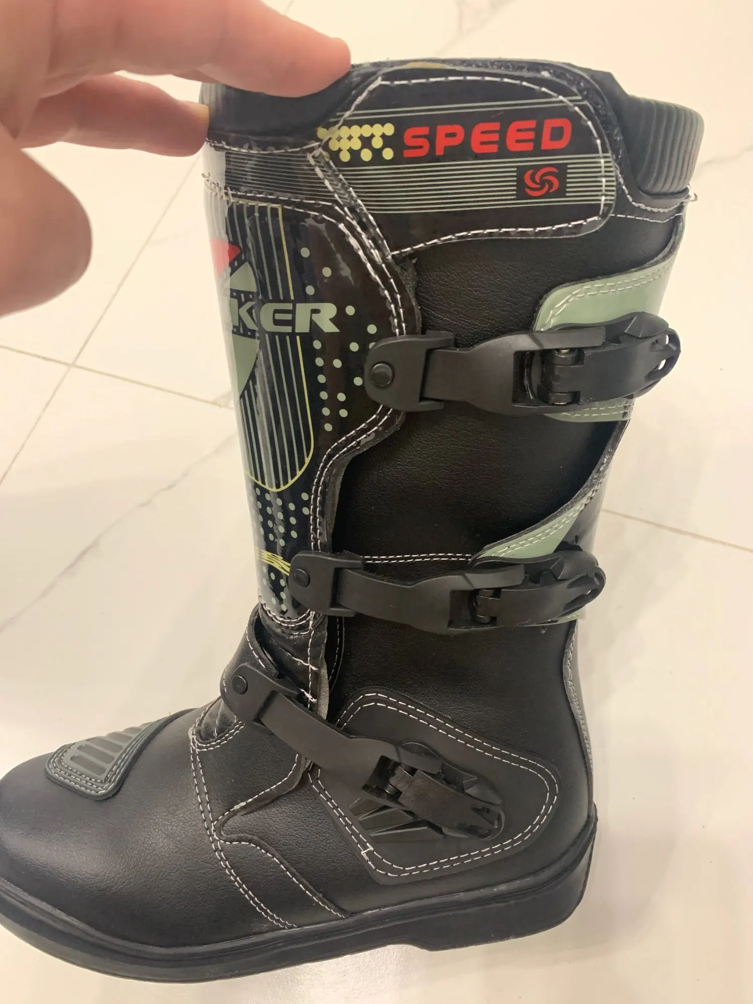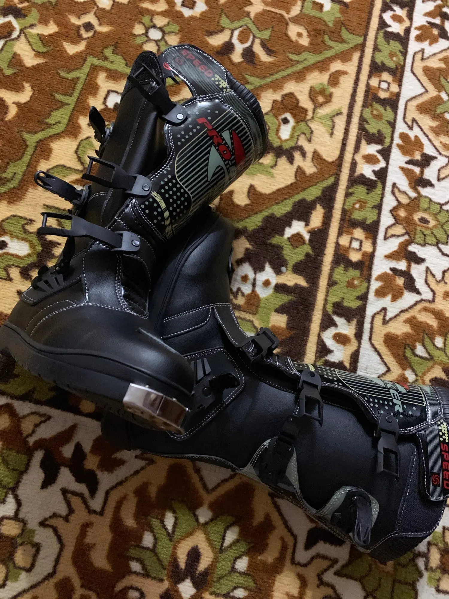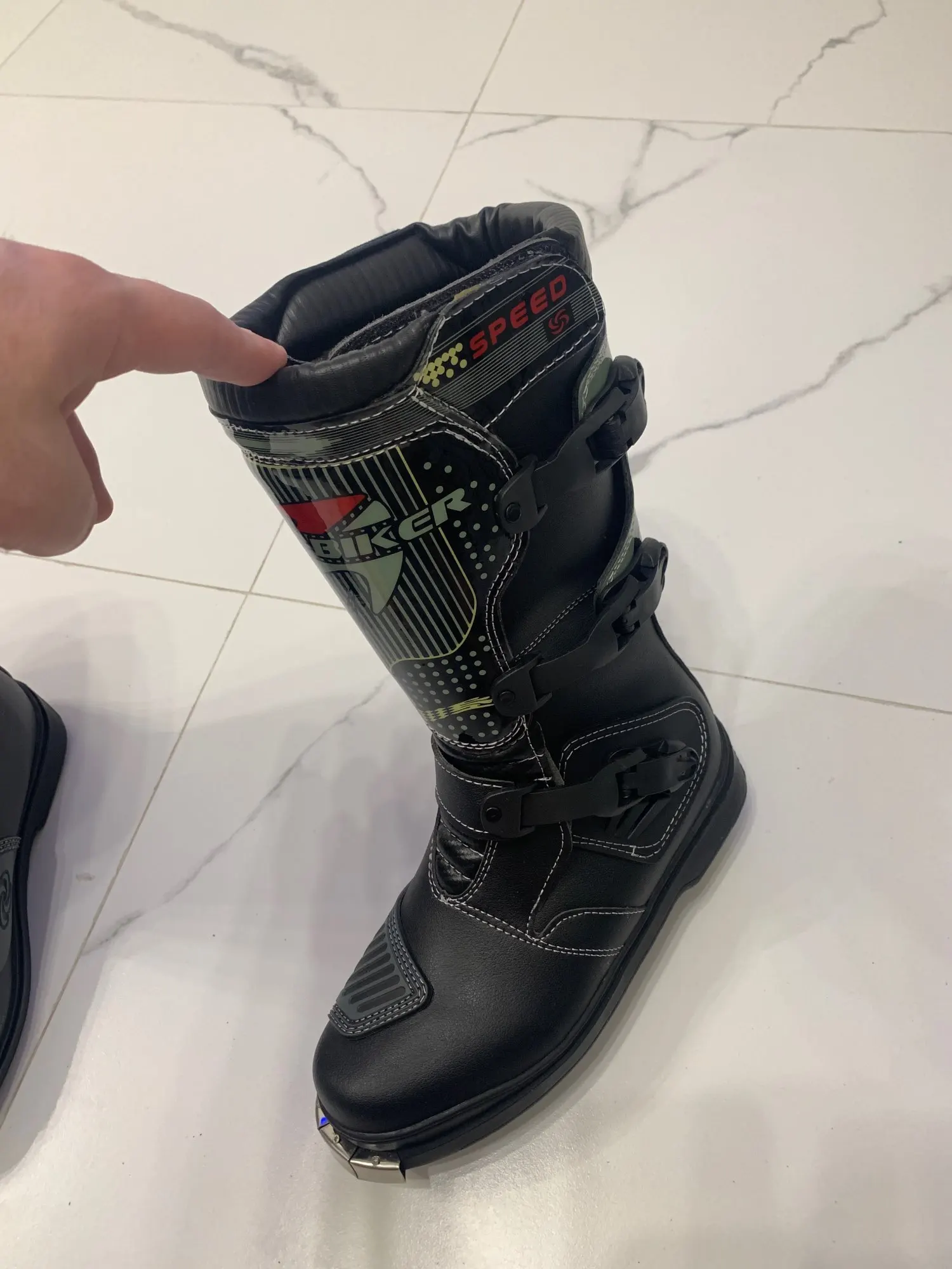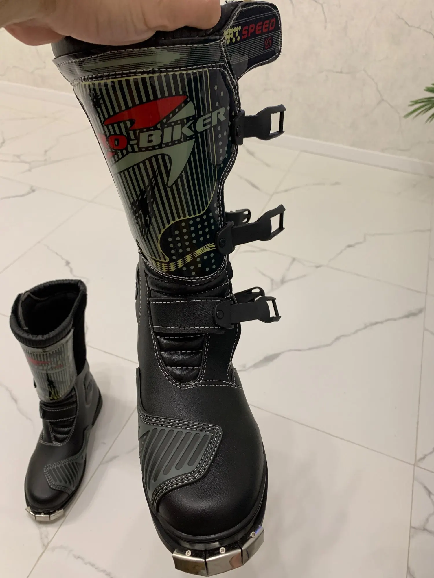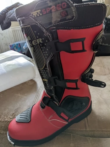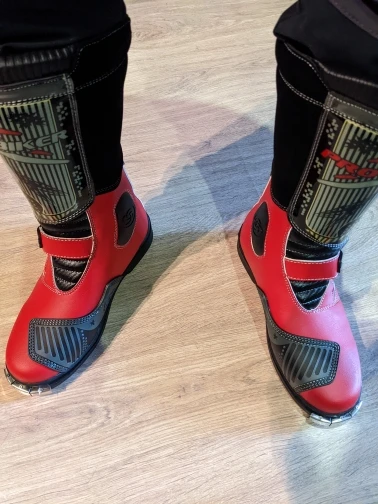 Боты дошли примерно за месяц. Брал за 5600 с доставкой. Особого качества не ожидал, поэтому в этом плане разочарований и восхищений нет. Пока только примерил… размерная сетка на сайте соответствует. 45 размер, для моей стопы 43,5 великоват. В защите думаю будет лучше. Подошва жесткая, носок тоже. Язычок у ботов пластиковый (типа защиты голени). Больше всего разочаровали застежки, есть ощущение что будут расстегиваться в процессе катания (при примерке расстегивались, если оттянуть носок). Стянуть боты ими тоже не получается (что-бы лучше сидел на ноге)… посмотрим, может в процессе эксплуатации будет лучше. Брал для катания по лесам-полям на питбайке. Надеюсь для этих целей мне их будет достаточно.