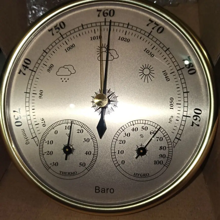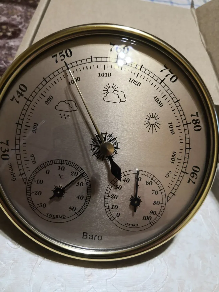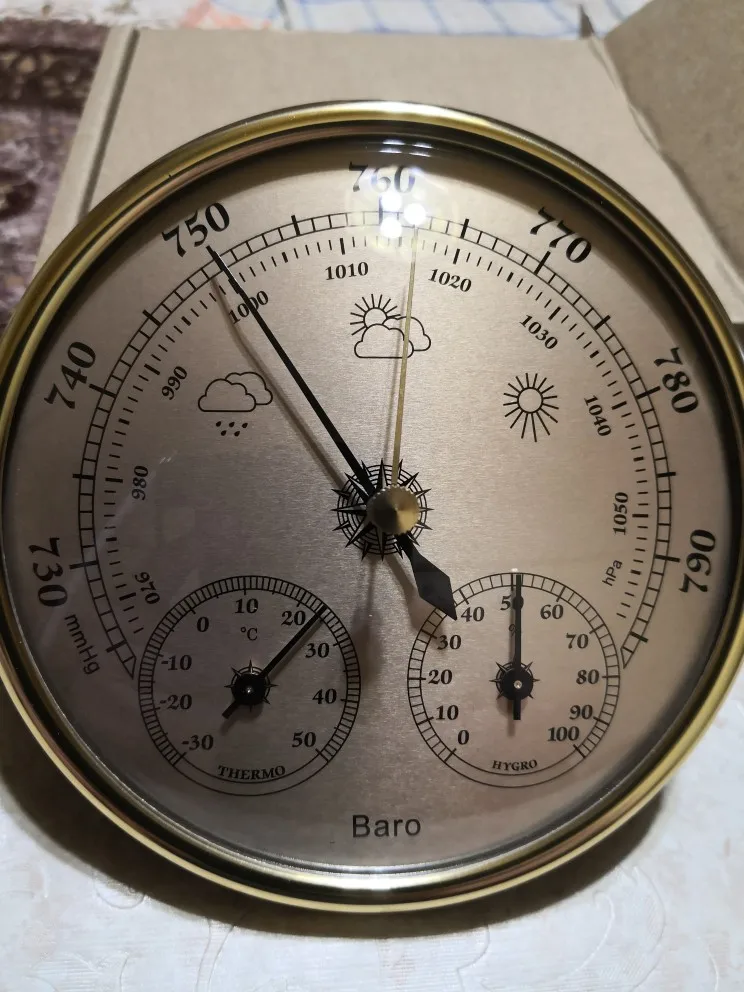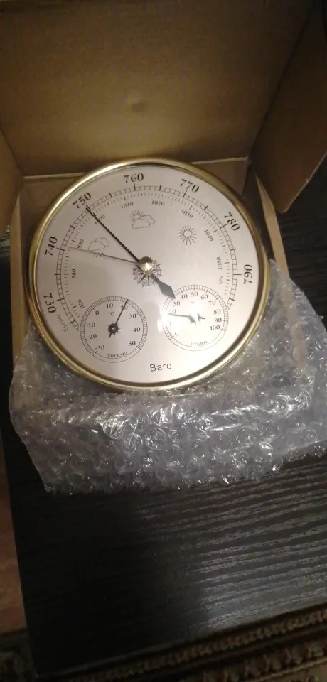 Товар приехал без повреждений, но упаковка слабая, сильно помялась. Стрелки температуры и влажности сразу зашевелились в нужном направлении, датчики работают. Стрелка давления тоже двинулась, точность проверим к вечеру. Устройство исправное, дефектов нет. Товаром довольны.