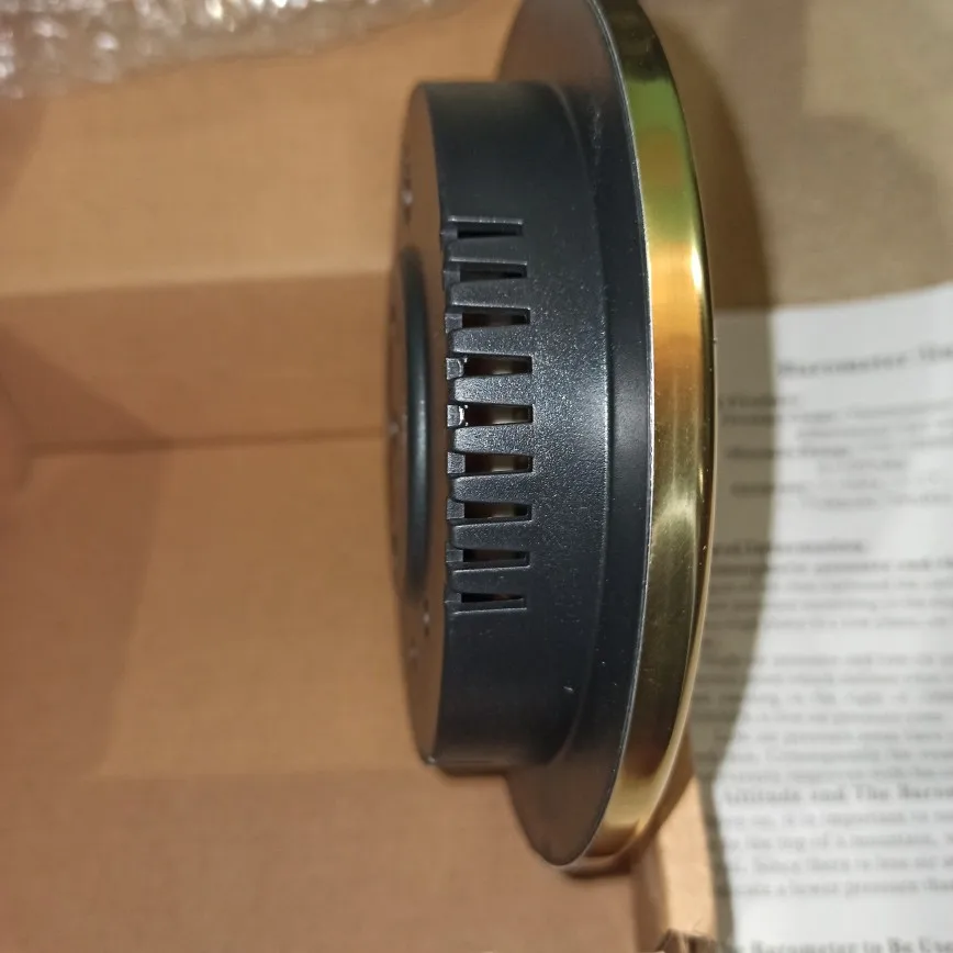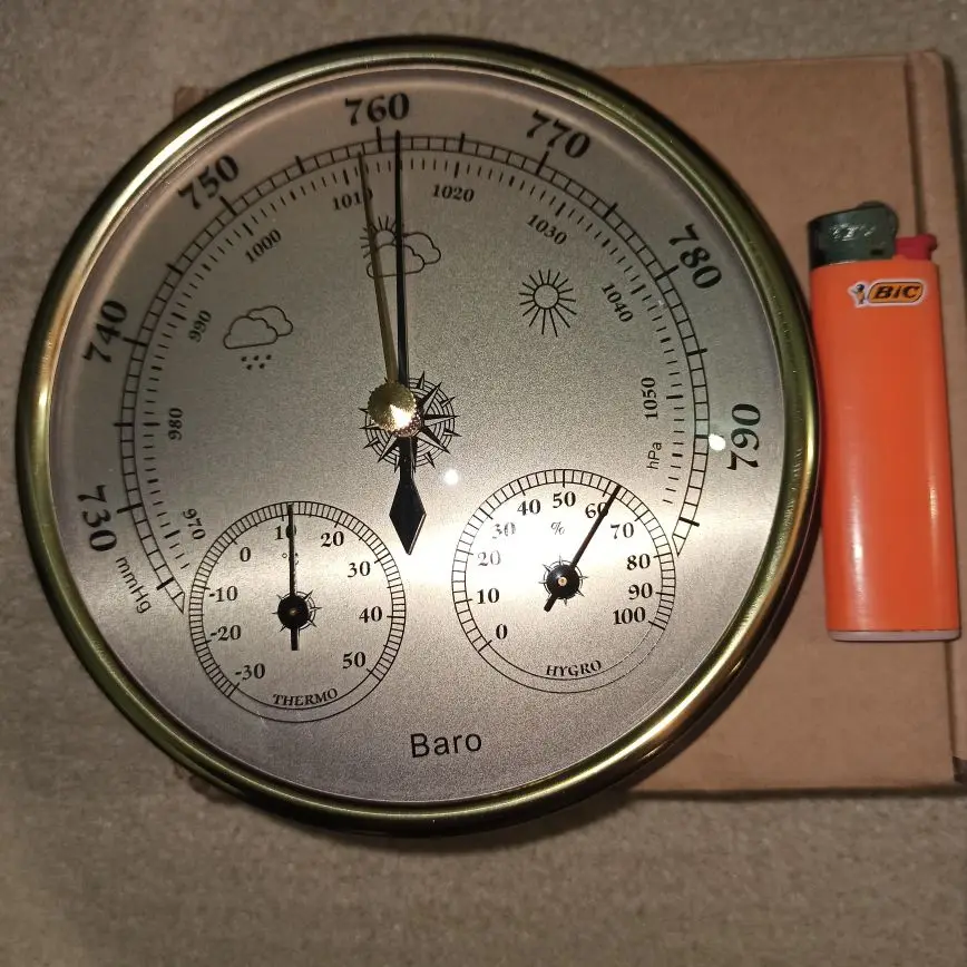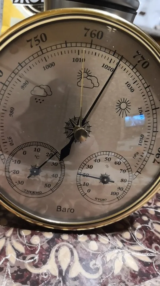 Продавец отправил тоаар быстро. Общее впечатление нормальное, атмосферное давление вроде верно показывает, влажность и температуру чуток подрегулировал. Цвет чуть отличается, фотография отображает реальный двет, со вспышкой получается более серебряным. В оригинале среднее, между золотом и серебром, на подобии светлой бронзы.