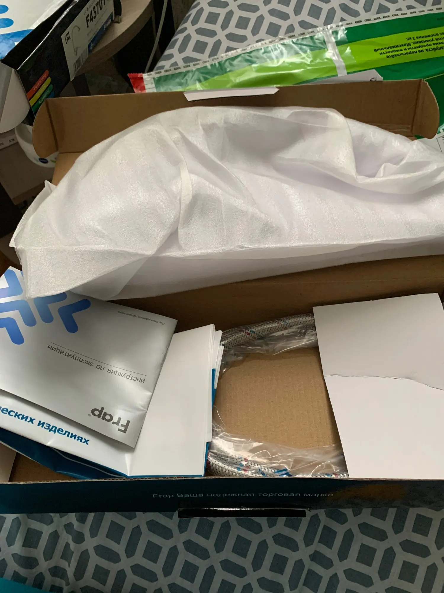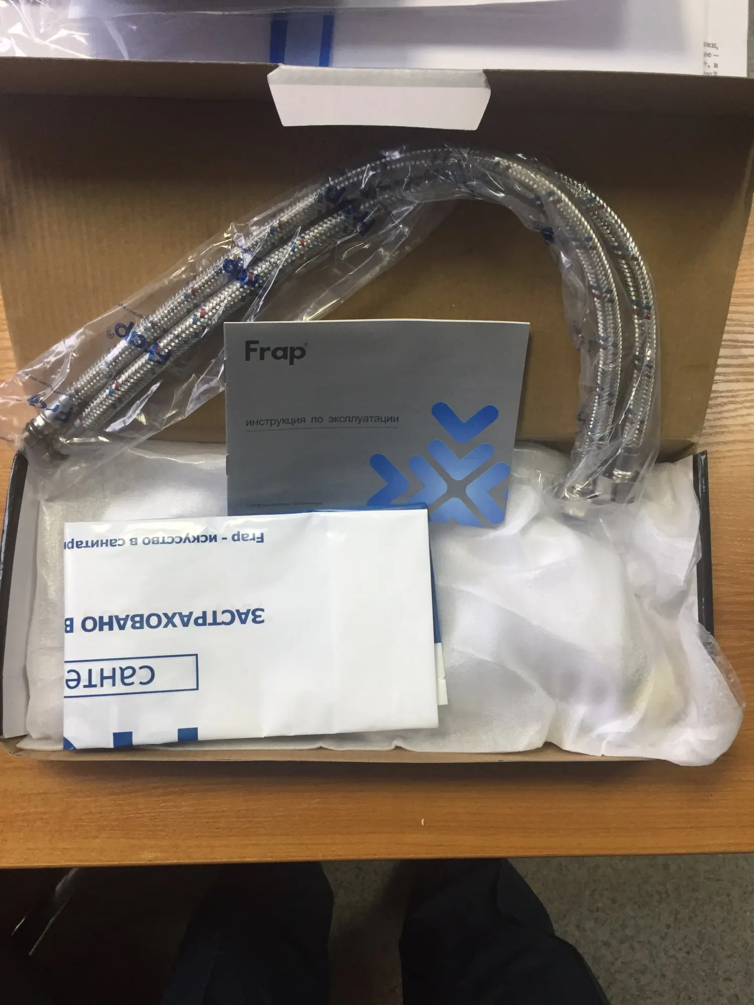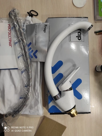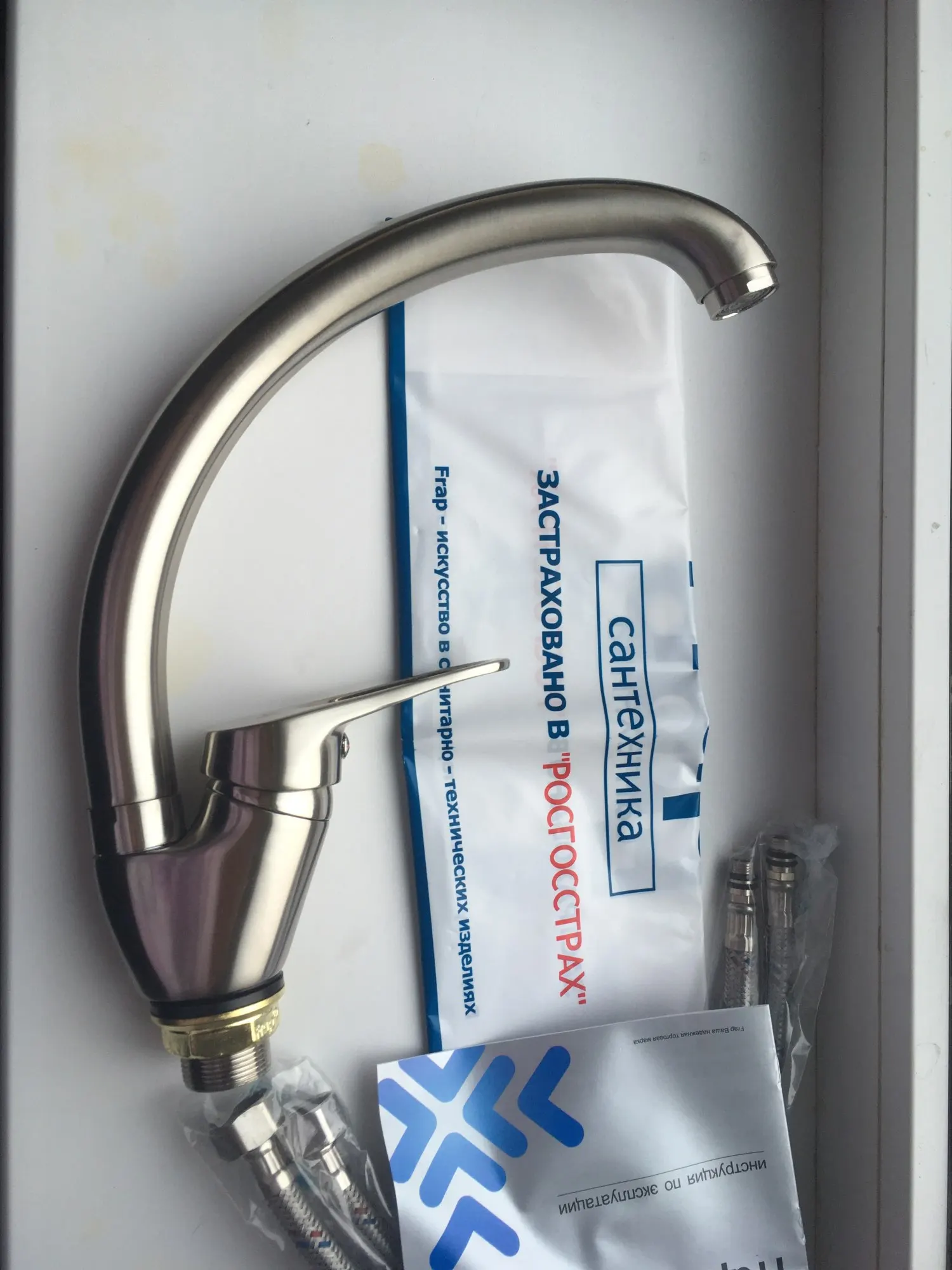 Спасибо, доставили быстро, курьером СДЭК. Кран очень аккуратный, тяжеленький, вращается мягко, в коробке инструкция с гарантийным талоном, подводка. Кран упакован в тканевый мешочек и флезелиновый пакет. Приложен фирменный пакетик Frap. Пока не устанавливали.