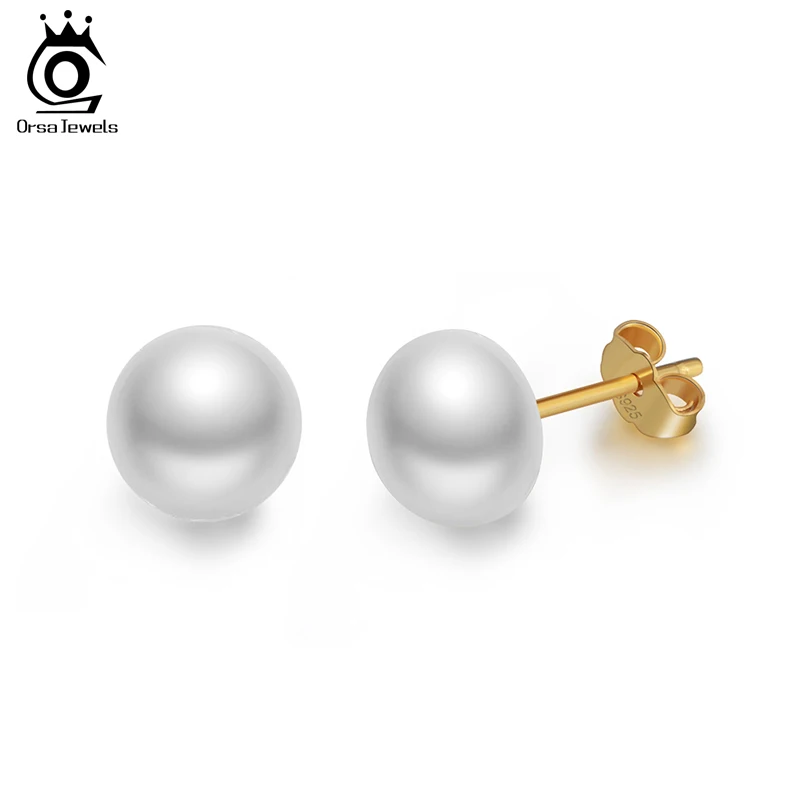 ORSA JEWELS, Настоящее серебро 925 пробы, серьги-гвоздики для женщин, настоящий пресноводный жемчуг, 8 мм, золотой цвет, Женские Ювелирные изделия для вечеринки, SE86