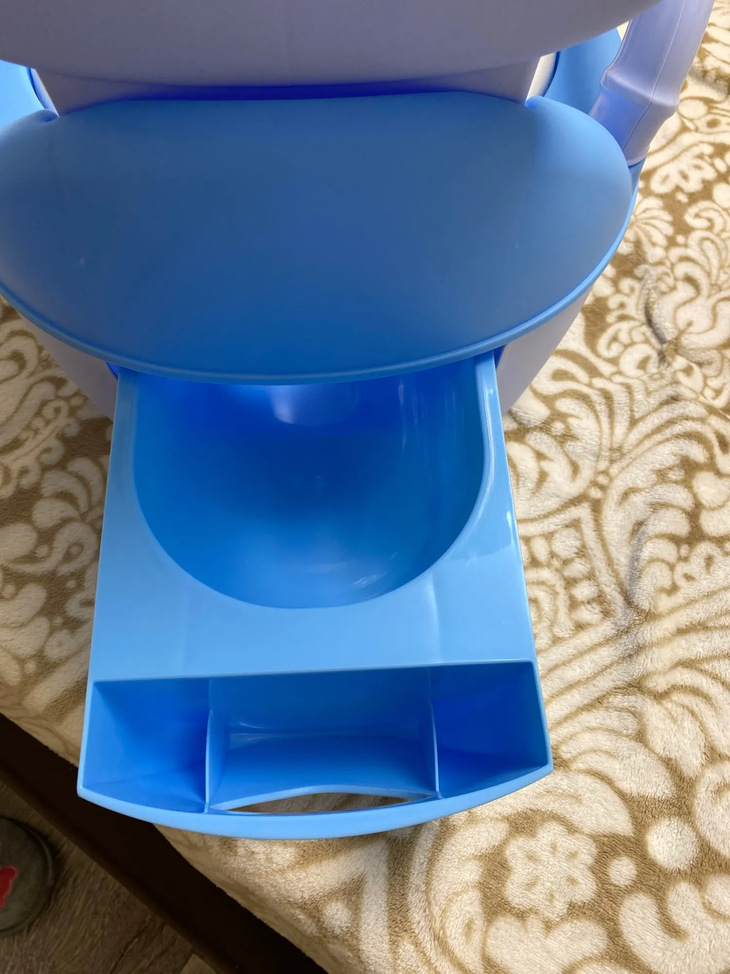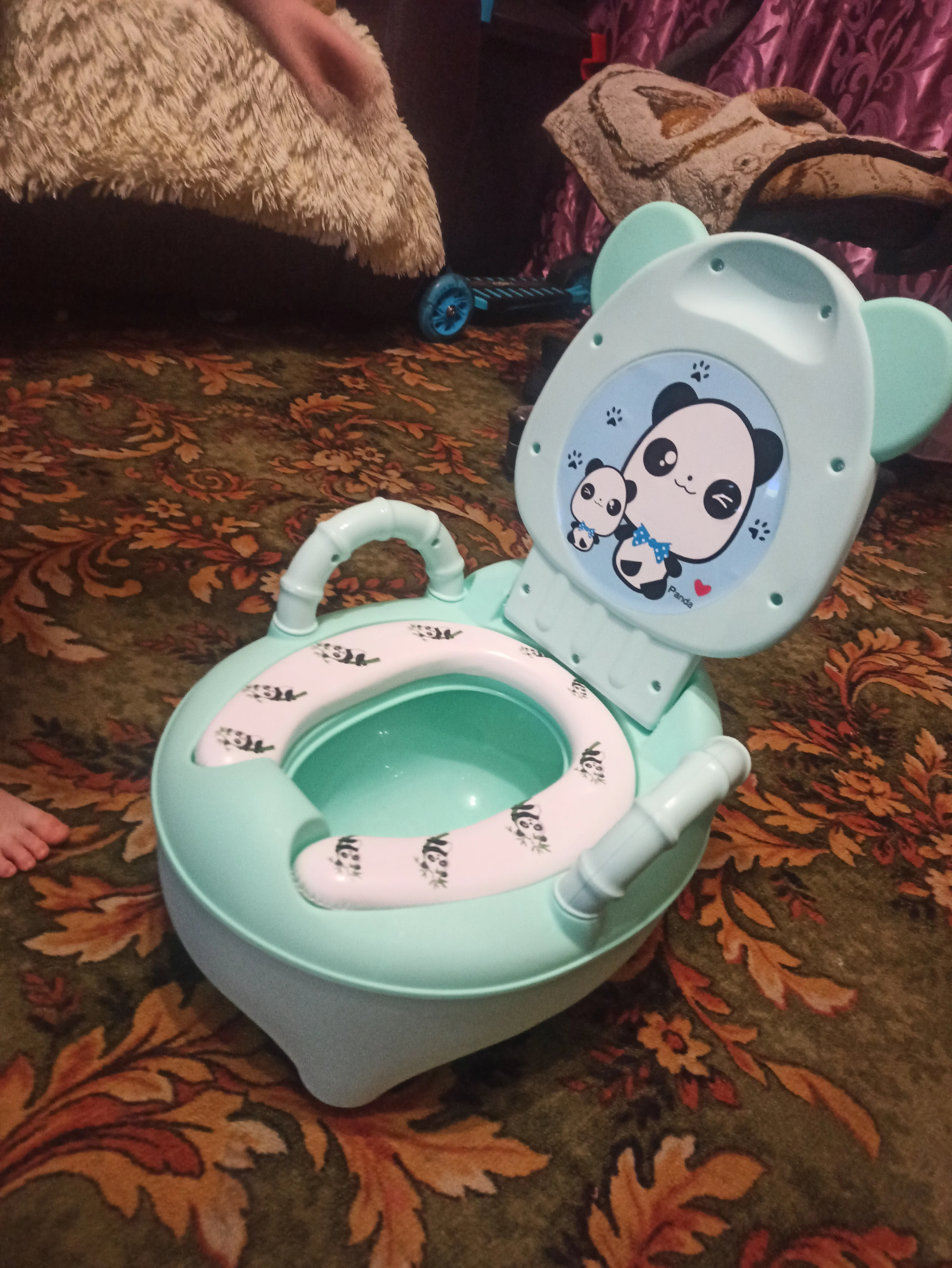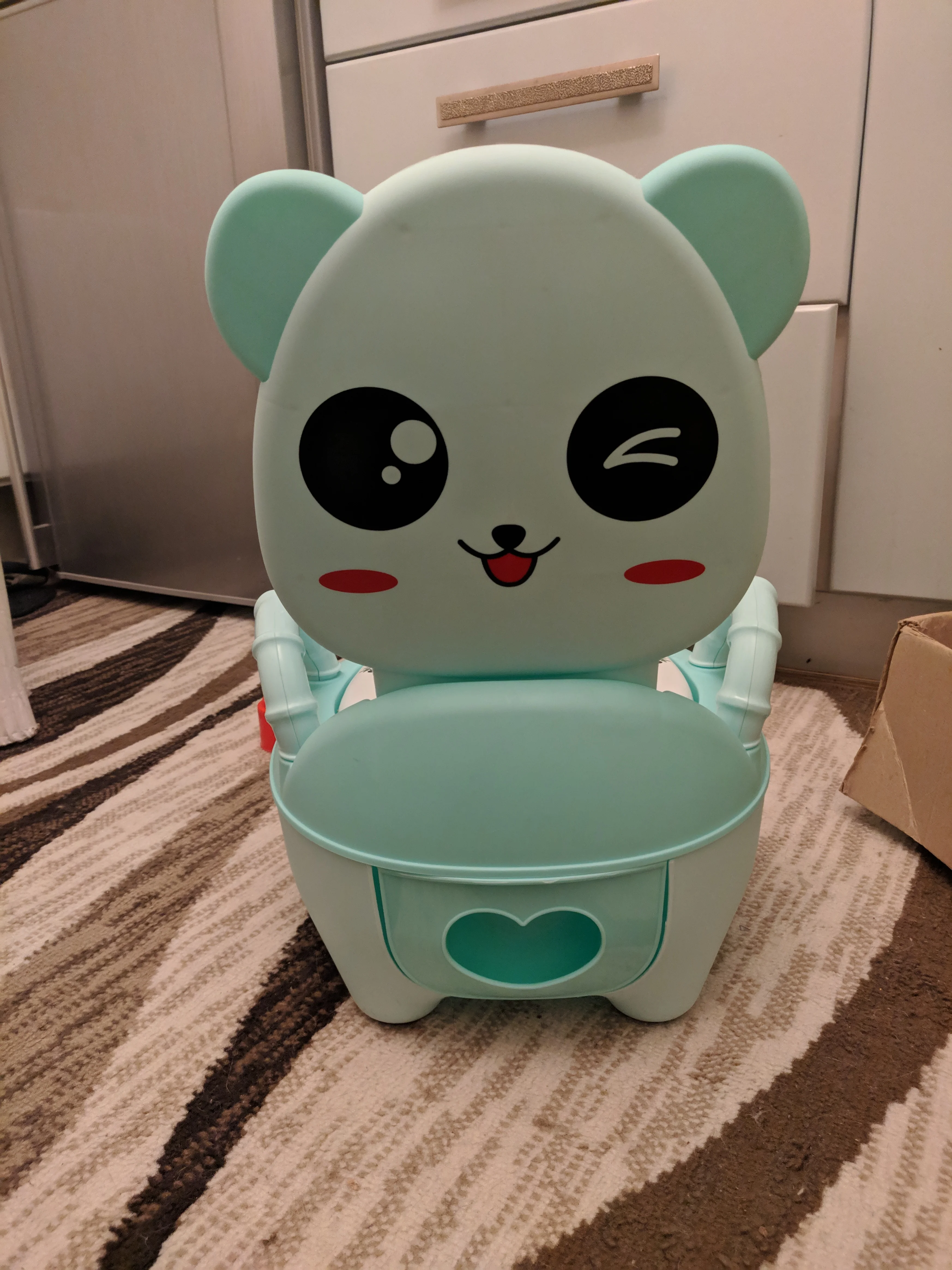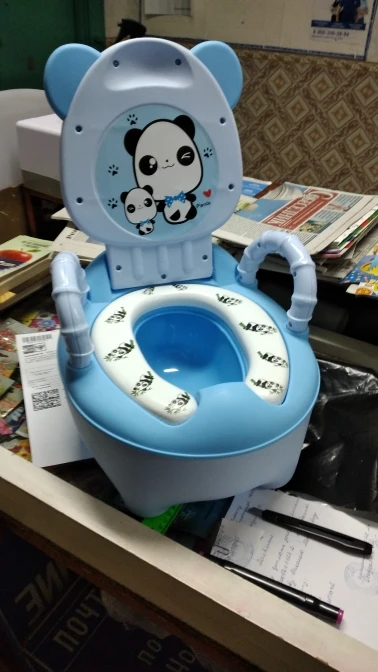 Забирала посылку на почте, хотя думала что привезёт курьер. Отсек для "подарочков" ребёнка болтается, приходится по нему хорошо ударить чтобы не вываливался,по фото видно что щели расположены не симметрично. Даже наклейку на крышке не смогли ровно приклеить. Боюсь что горшок прослужит недолго, пластмасса самая дешёвая. Хотела сэкономить, но по ходу придётся ещё горшок брать,но уже не у этого продавца
