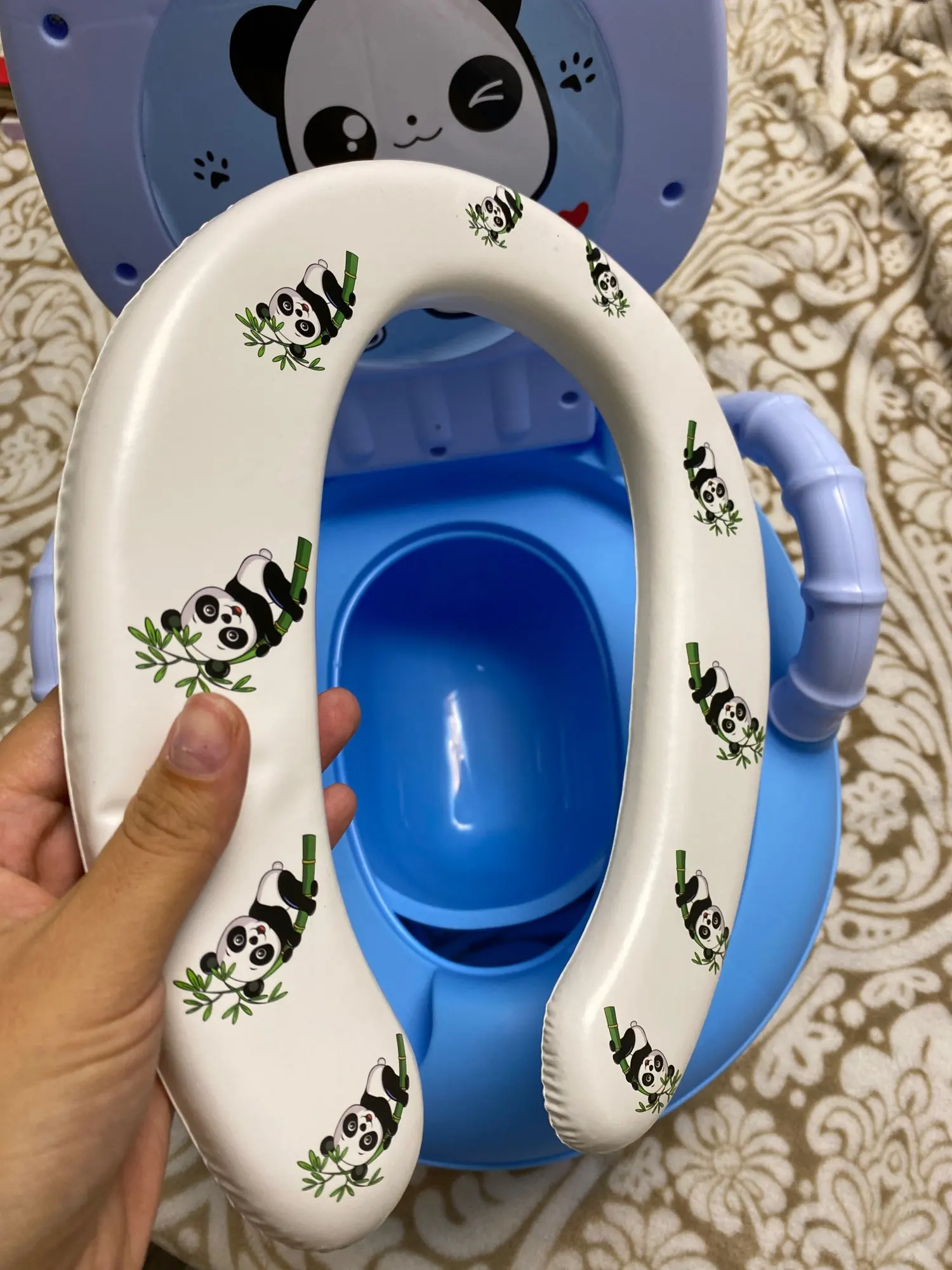 Товар пришёл быстро, весь целый, без царапин и сколов. С продавцом не общалась не было необходимости. Упакован товар не особо хорошо, в одной коробке, и пакете, это минус. Сидулька мягкая, прорезиненная , моется легко, рисунки не стёрлись, запаха нет. Рекомендую.