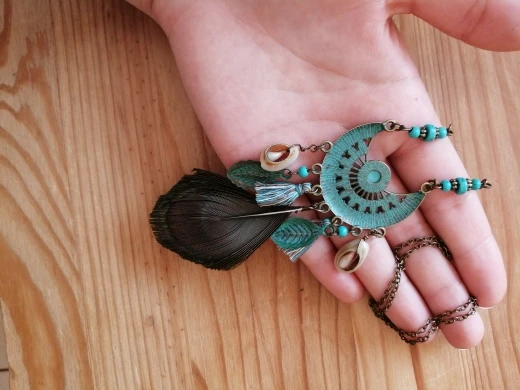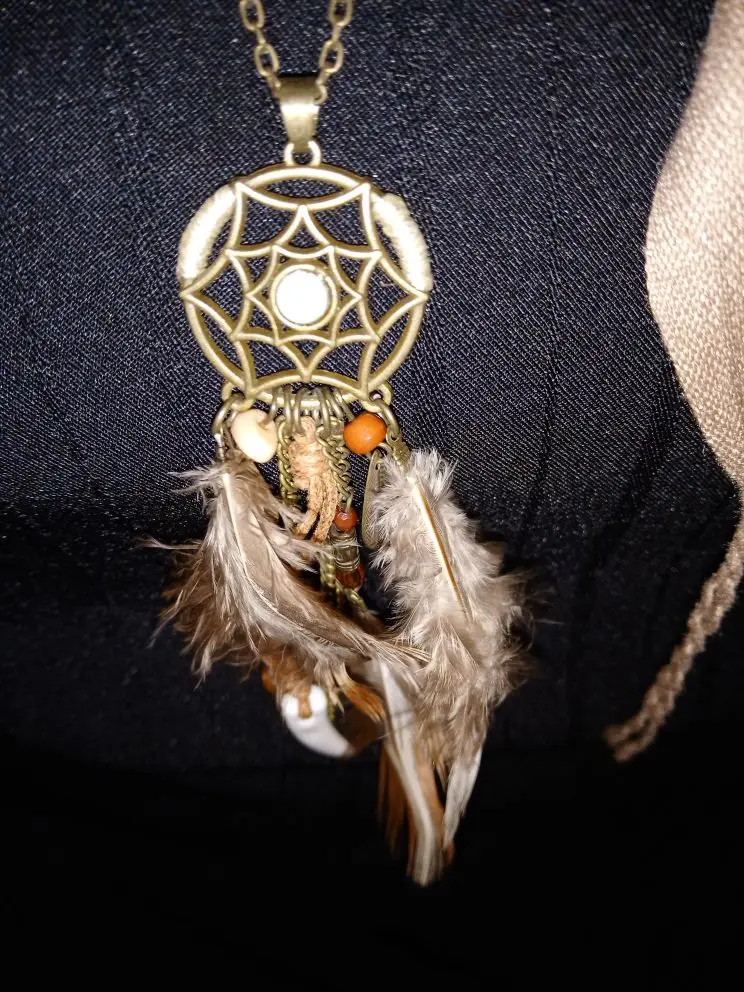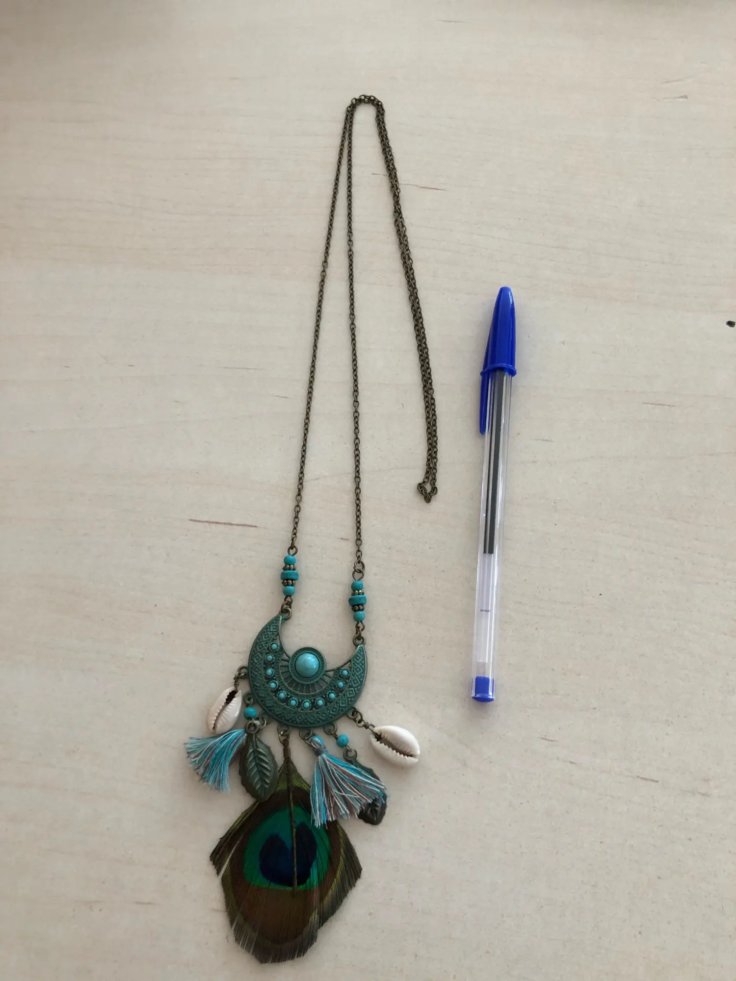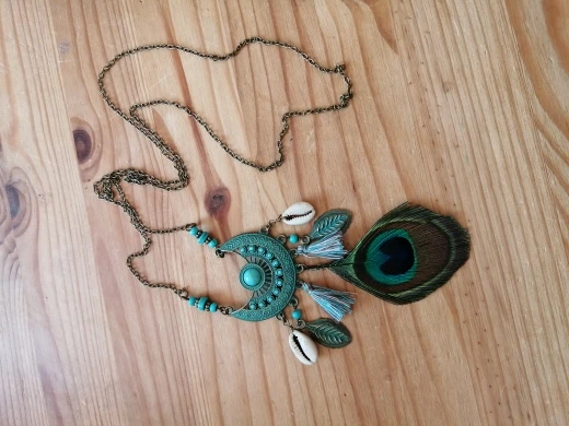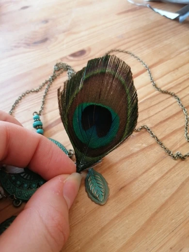 Симпатичная побрякушка ;) Легкое украшение с довольно длинной цепочкой без замка - можно укоротить, но так, что бы голова все таки проходила, или придется замочек докупать. перышко, на мой взгляд, по краю обрезано довольно грубо, неровно, углами и сколами. Выровнять не получится, т.к. и так в плотную к естественному рисунку пера обрезано, без запаса. Но может так и задумано?В целом красиво.