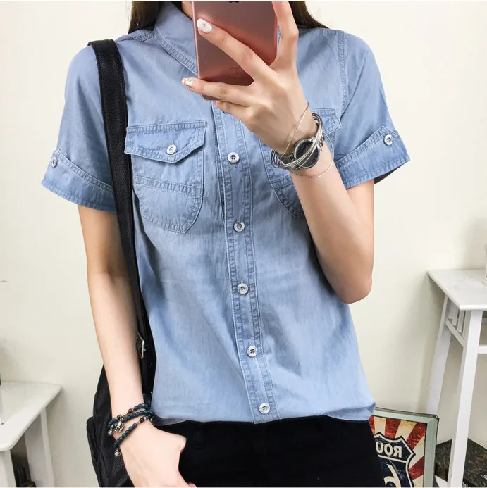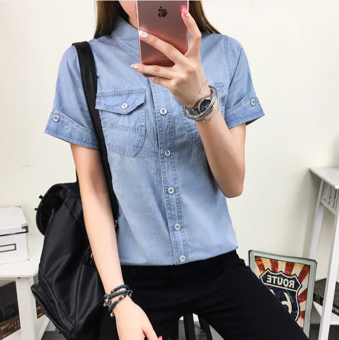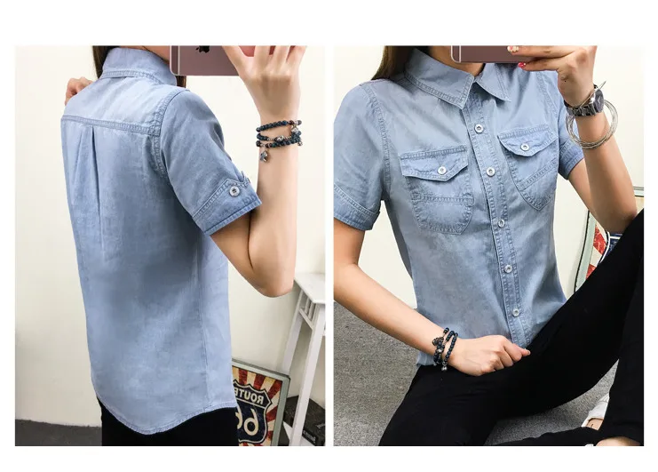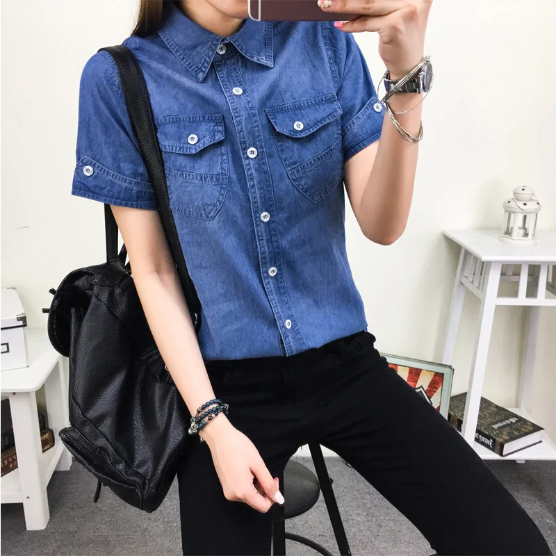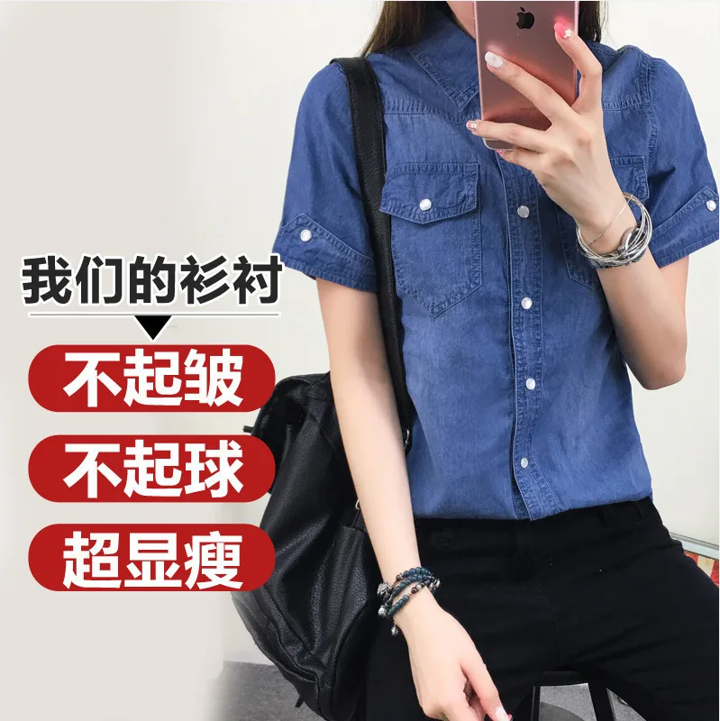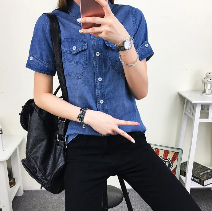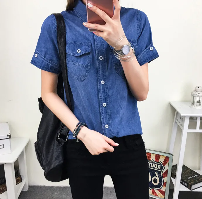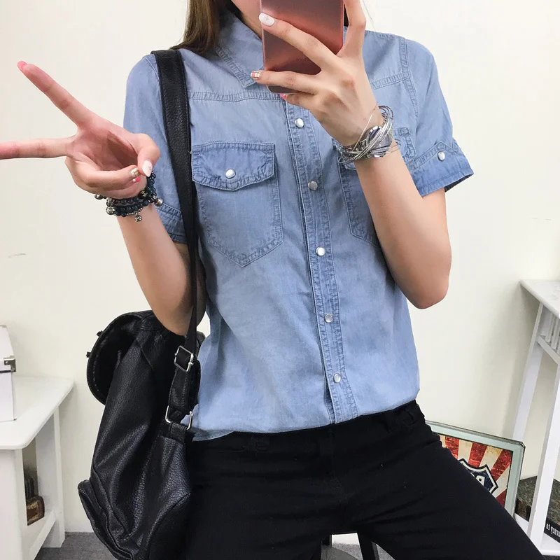 #2950 2021 летняя хлопковая джинсовая рубашка женская с коротким рукавом приталенная в стиле преппи Повседневная Джинсы Джокера рубашка Женская Базовая Блузка