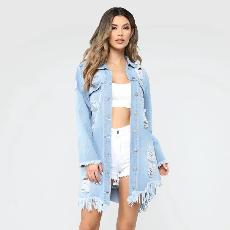 Женская джинсовая куртка с дырками и кисточками, свободная длинная куртка из джинсовой ткани, уличная одежда, осень 2021