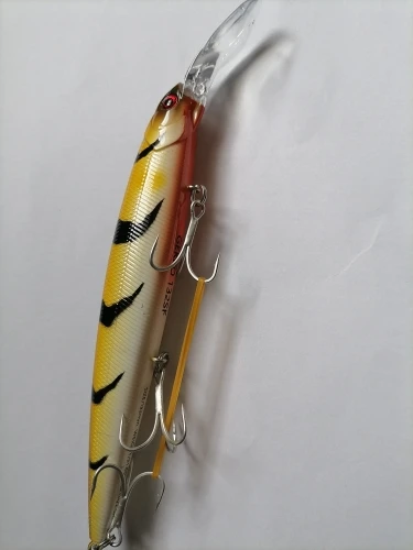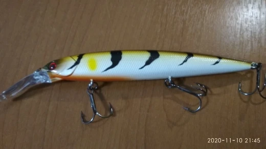 Отличный воблер. На твичинге заглубляется метра на 2,5 но рыбу выманивает с 4 и даже поглубже. Для лодочного твичинга самое оно. Система дальнего заброса не очень Против ветра много перехлестов, но уловистость того стоит. уже два лета косил на него щуку. Норму вылова за 2-3 часа. Было 3 штуки. Все отгрызены щуками на промахе - выше поводка 20 см.