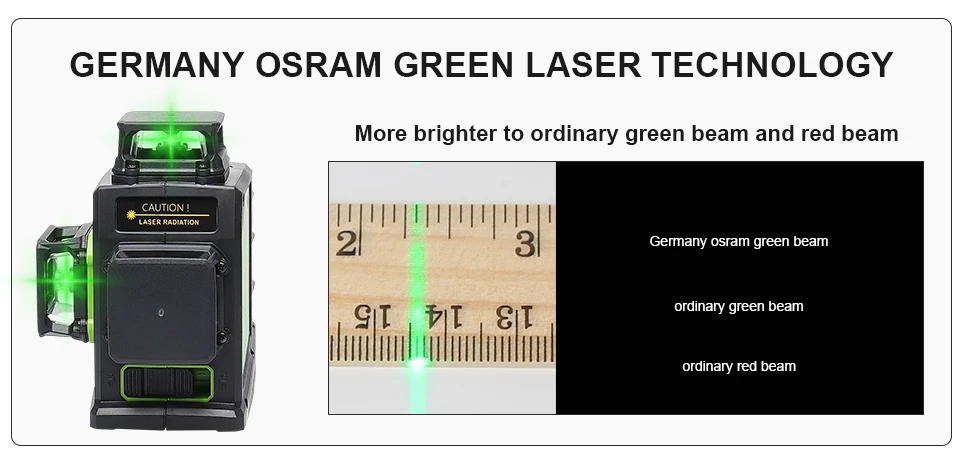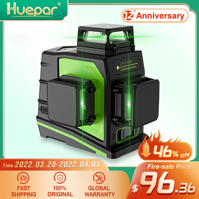 Лазерный уровень Huepar 12 линий 3D, самонивелирующийся 3x360 градусов, вертикальный и горизонтальный крест, зеленый лазерный луч, линия, зарядка через USBХарактеристики: