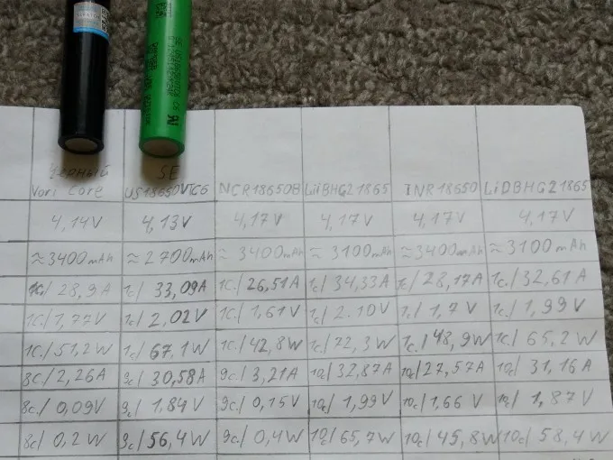 Здравствуйте. Я уже не первый раз покупаю аккумуляторы (ак.) на Али. И решил сделать небольшое тестирование 6х разных ак. И определить какой из них самый высоко токовый. Все тонкие железные (никилированые) пластинки с них были убраны так как они и точечная сварка их не обеспечивают требуемую проводимость больших токов. На первых двух фотках видно емкость и напряжение заряженных ак. На 3-й фотки сам стенд, в качестве нагрузки проволока не меняющая своего сопротивления при нагреве (название забыл). На 4-й фотки параметры одного ак. после 10 с. разряда. На 5-й записал полученные результаты в таблицу после тестирования всех 4-х ак. Как не удивительно но лучшим по параметру токо отдача оказался один из дешёвых ак. LiiBHG21865 который в распродажу можно приобрести по 110р. за шт. Если вам не сложно то вы можите потдержать меня приобретя лучший ак. по моей ссылке: https://goo-gl⚽su/Y1tfx8 (В место "⚽" поставь ".") Зеленая кнопка для перехода под рекламой