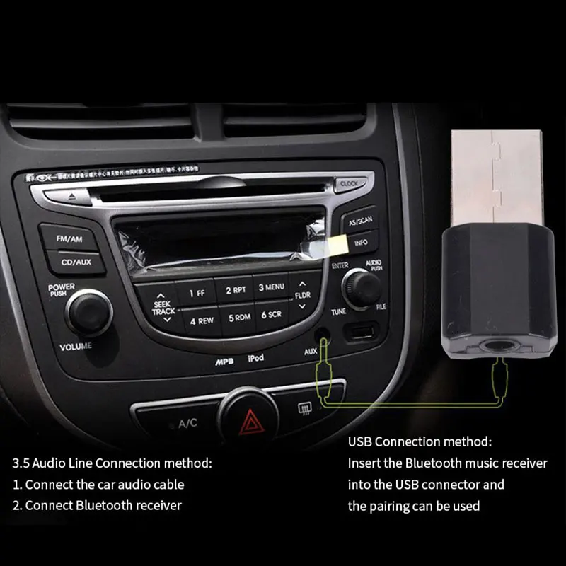 2. Метод подключения Аудио: Подключите обе стороны Aux кабеля в bluetooth-приемник и порт Aux
