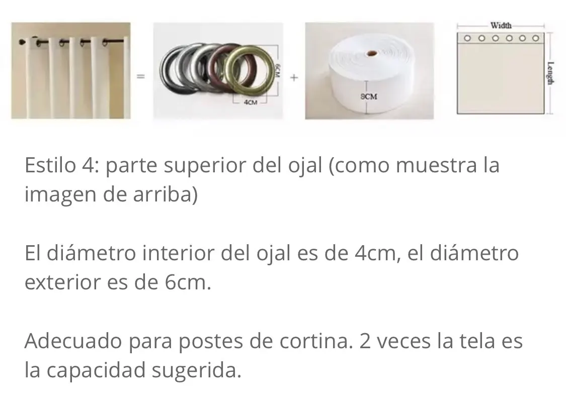 Описание продукта на испанском языке не совпадает с описанием на английском языке, и по ошибке в этом описании я попросил неправильные шторы. По-испански это стиль 4 и по-английски Стиль 2 (тот из ojales). Я хотел бы изменить их, и продавец не отвечает. Прилагается изображение публикаций.