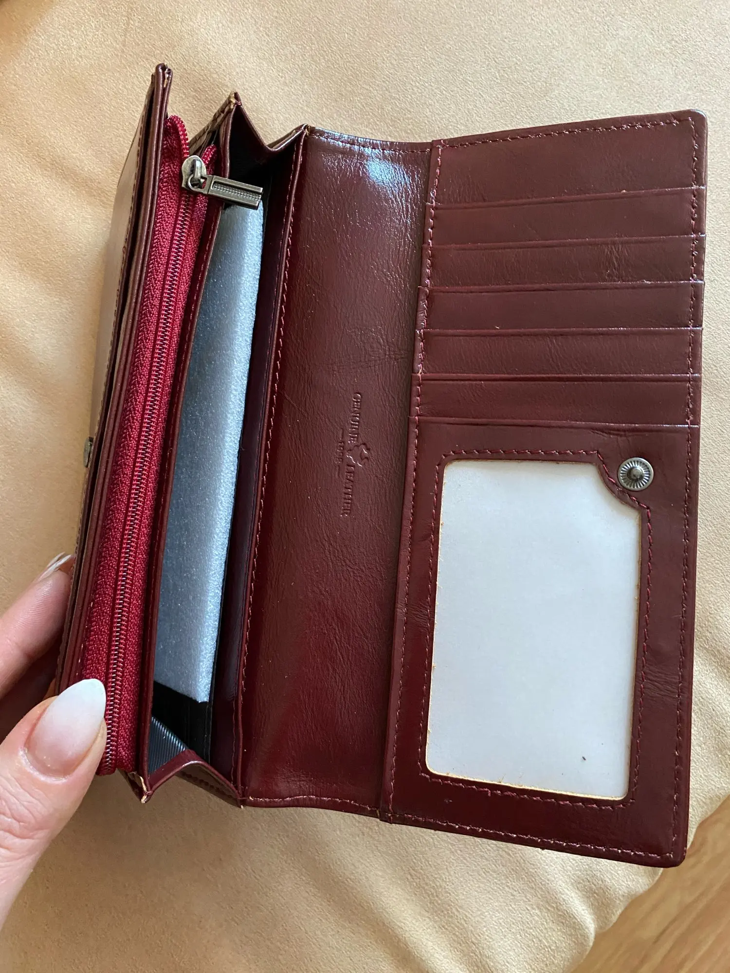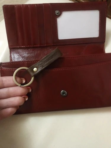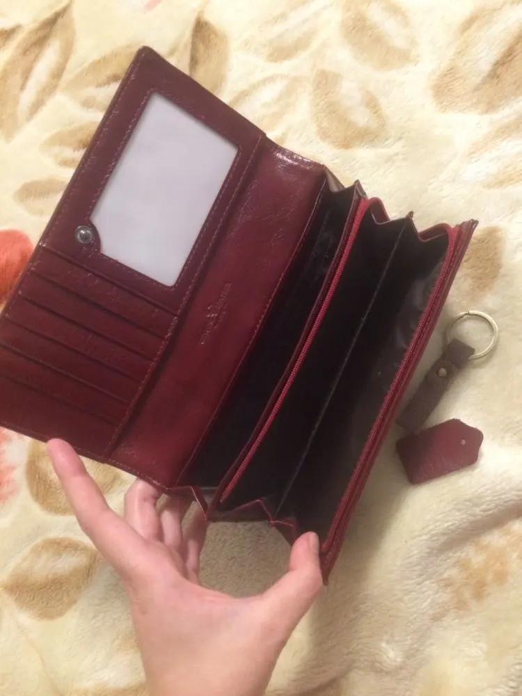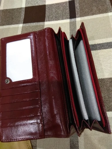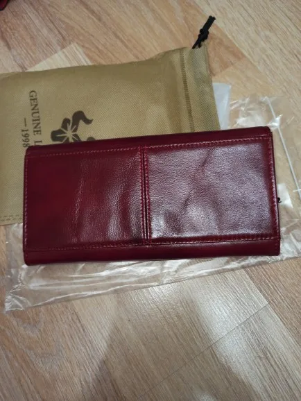 Кошелек очень хороший. Пошит хорошо, швы ровные и аккуратные. Кожа натуральная, мягкая, качественная. Присутствует запах натуральной кожи. В общем все хорошо, единственное - цвет скорее темно бордовый, чем красный. И от этого немного обидно.
