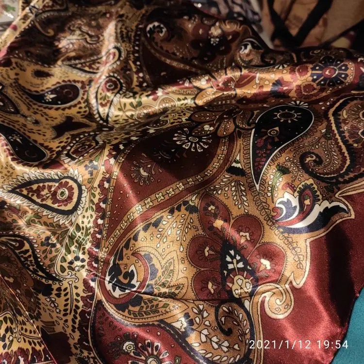 Заказ доставлен очень быстро, всего за 2 недели до Москвы! Трэк отслеживался подробно, вплоть до почтового отделения. Качество не просто хорошее, оно выше всяких похвал. Материал тонкий, шелковисто-атласный, приятный на ощупь. Дизайн рисунка изумительный! Цветовое решение супер, тёмный бордо с бежевым! Изготовлен платок очень аккуратно, швы ровные, едва заметные. Очень красивый платок! Как же я довольна! Спасибо продавцу за качественный товар в его магазине! Заказывать буду еще у этого надёжного продавца. К сожалению, на моих фото платок выглядит несколько ярче, а вот фото продавца на странице заказа один в один совпадает с реальным цветом платка. 5+++