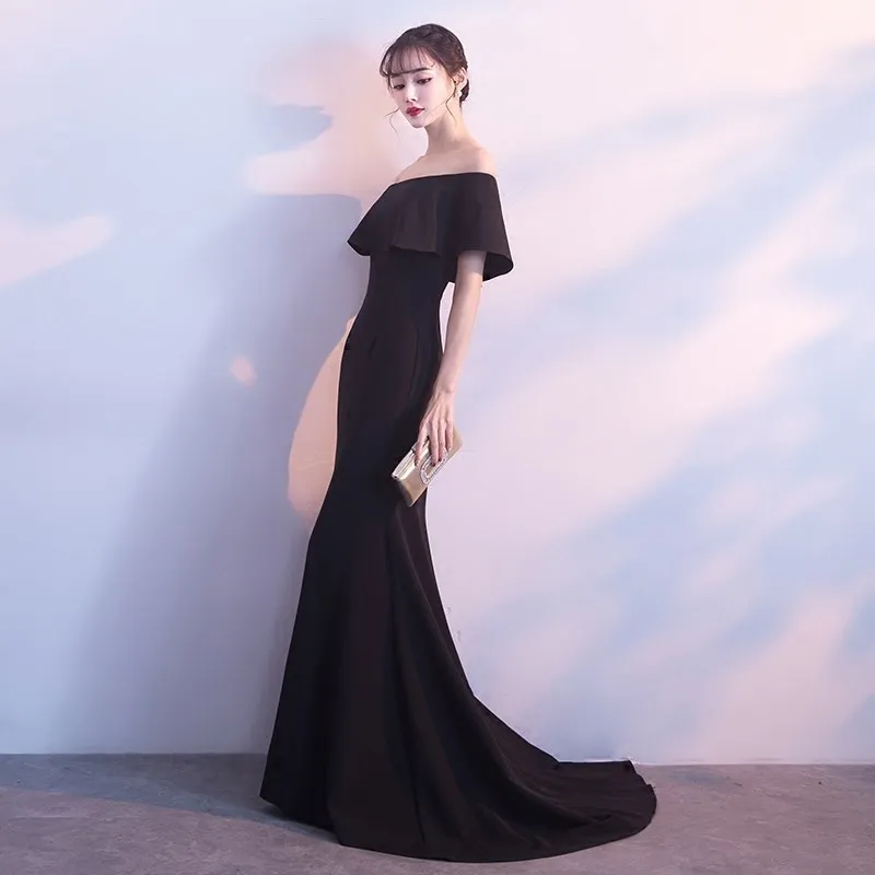 DongCMY официальное длинное черное вечернее платье с открытой спиной вырезом лодочкой Русалка со шлейфом вечерние женские платья