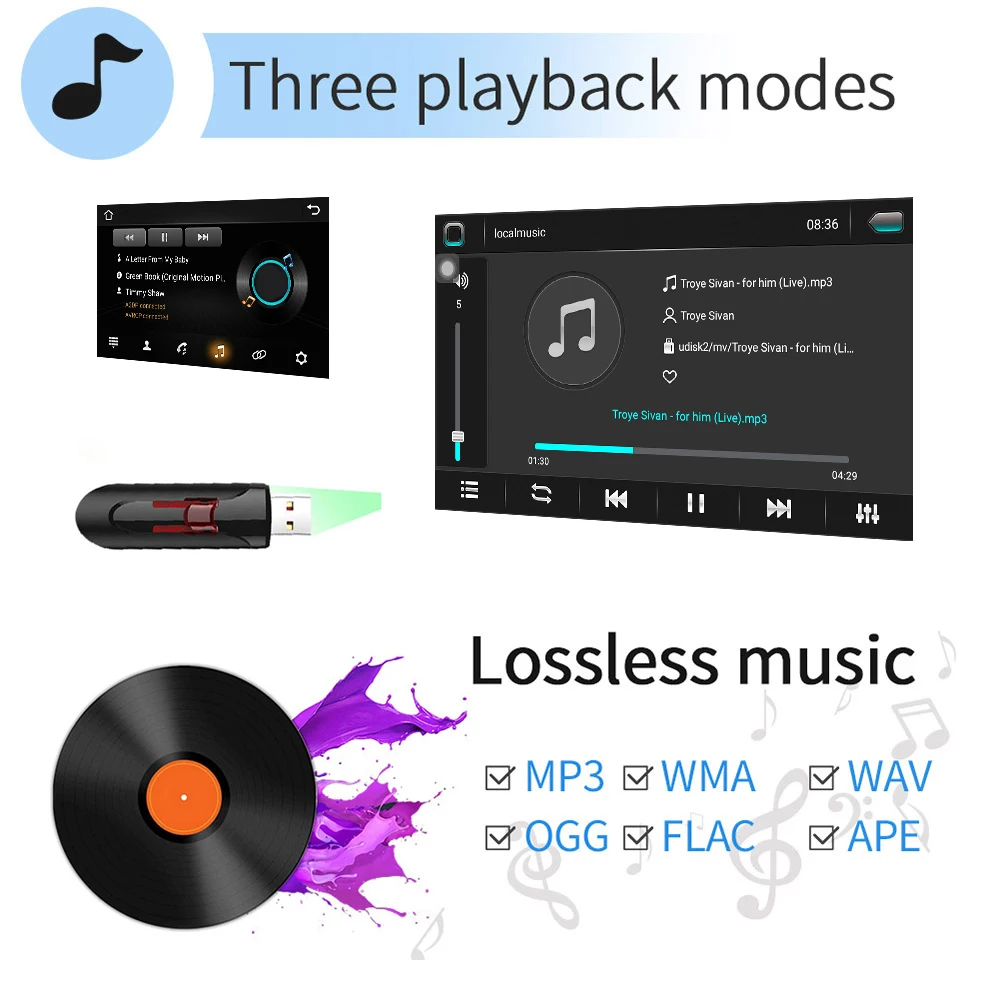 ● FM-радио: онлайн-музыка вы можете передать музыку на автомобильную стереосистему через FM, чтобы наслаждаться оригинальным автомобильным стереозвуком, с 18 предустановленными станциями