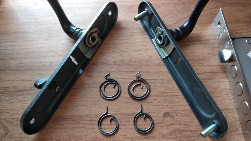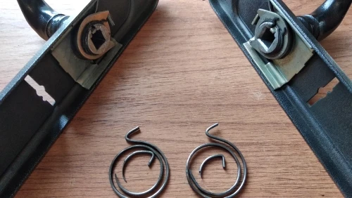 Выбрал не ту пружину, надо было брать второй вариант, но это конечно не вина продавца, моя ошибка. Пружина толще чем родная и замок нормально не сел в паз-не хватило места, разогнул его и он зафиксировался . В целом держится, работает, ручка на месте.