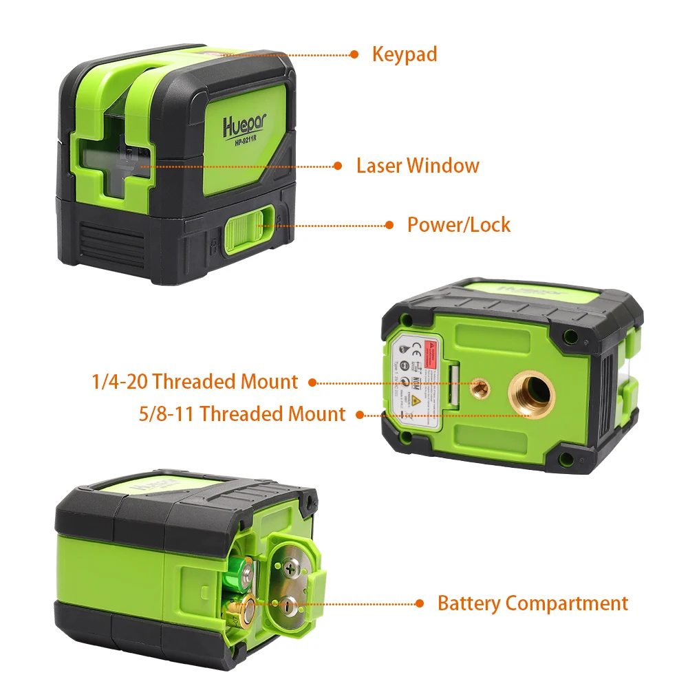 2 в 1 набор инструментов:Выложите Два зеленых луча с комбинацией точек вверх и вниз от пола до потолка, Расширенный Угол может достигать 180 градусов. Huepar 9211R сочетает в себе все особенности 9011R плюс две точки.