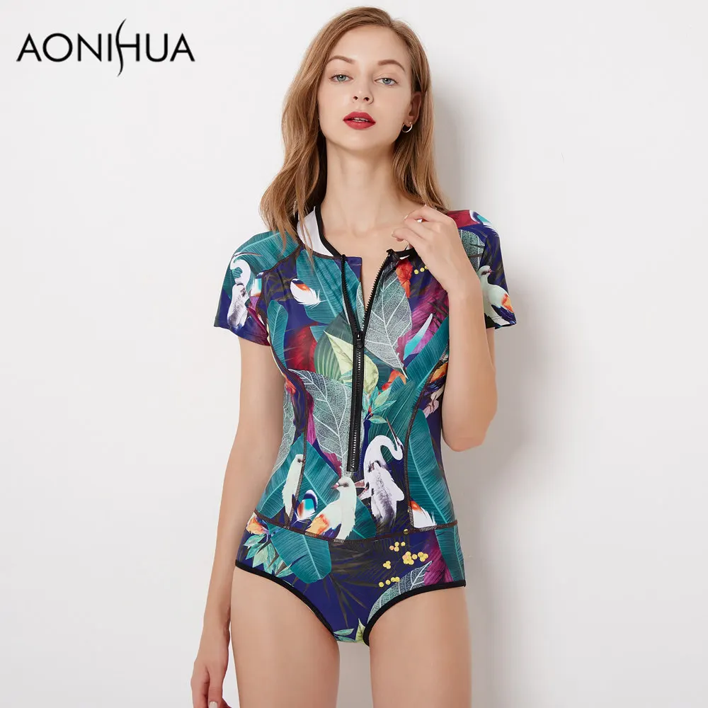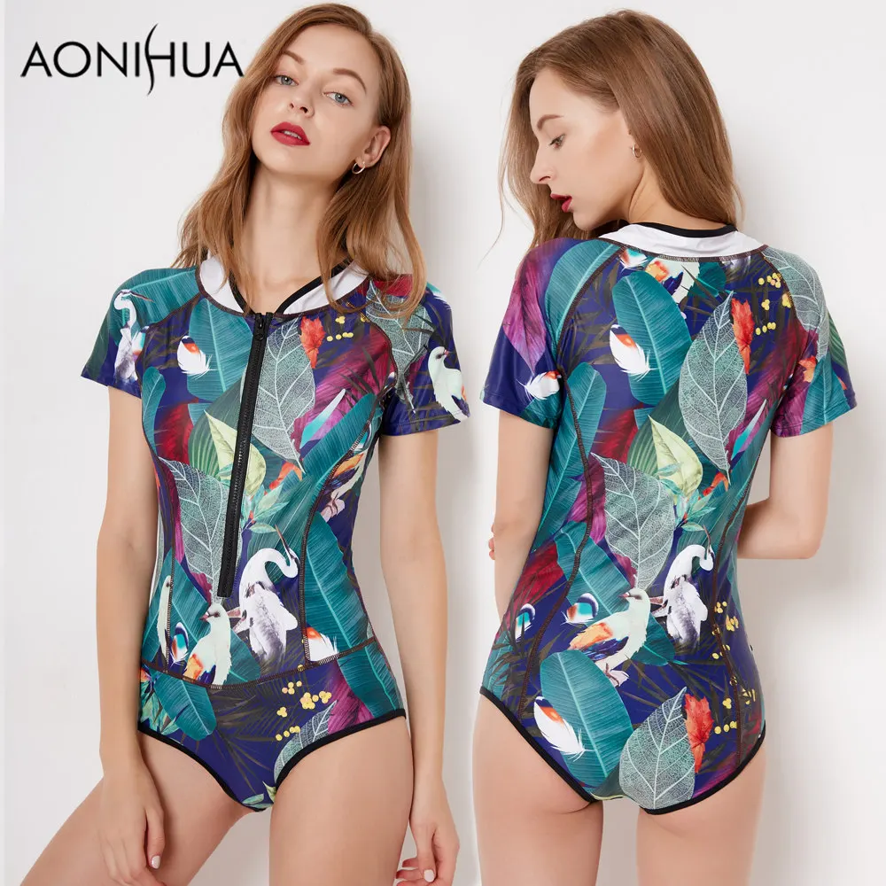 Женский слитный купальник AONIHUA, с принтом в виде зеленых листьев и винтажных птиц, с коротким рукавом, для серфинга, 2018