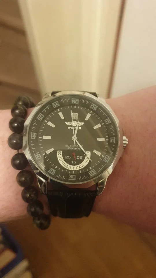 Часы симпатичные. Пока новые, всё четко видно, но размер часов немного великоват, а вот окно даты наоборот - мелковато, по-этому что бы увидеть дату приходится присматриваться. Доставка быстрая.