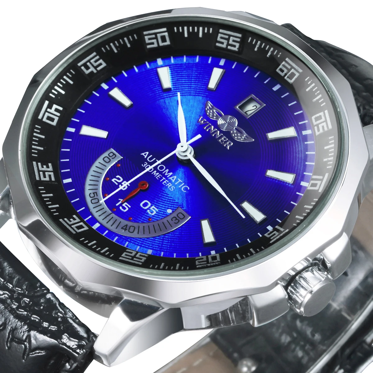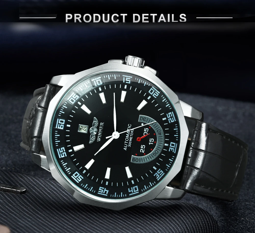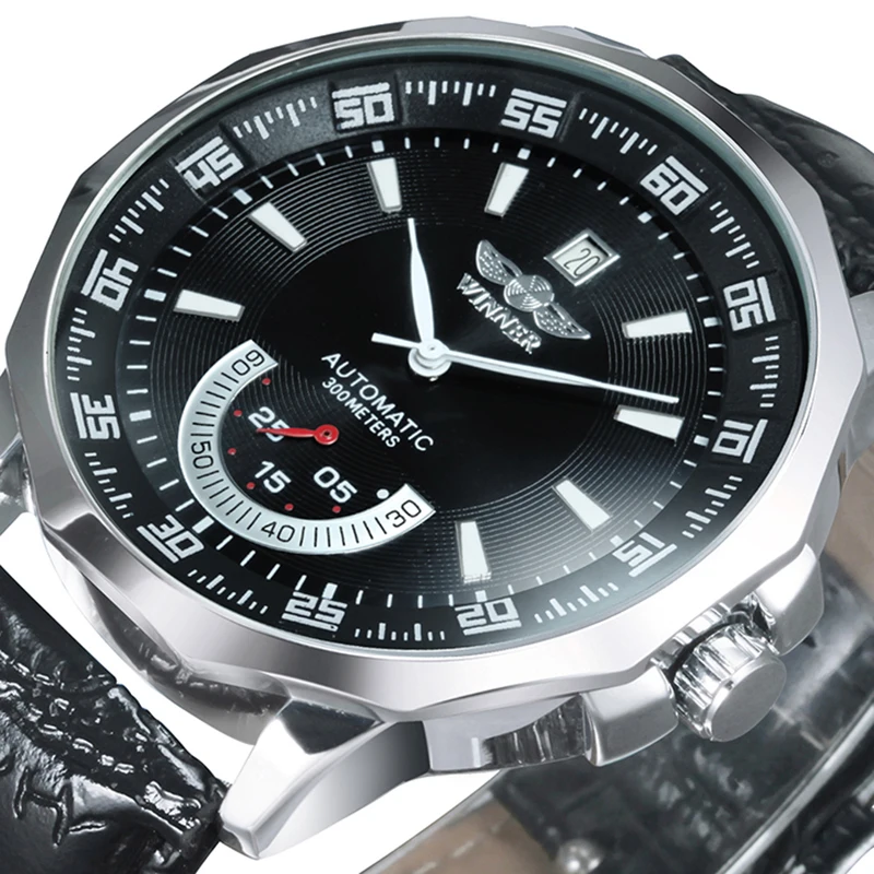 Часы мужские механические WINNER, с автоподзаводом, кожаным ремешком и календарем