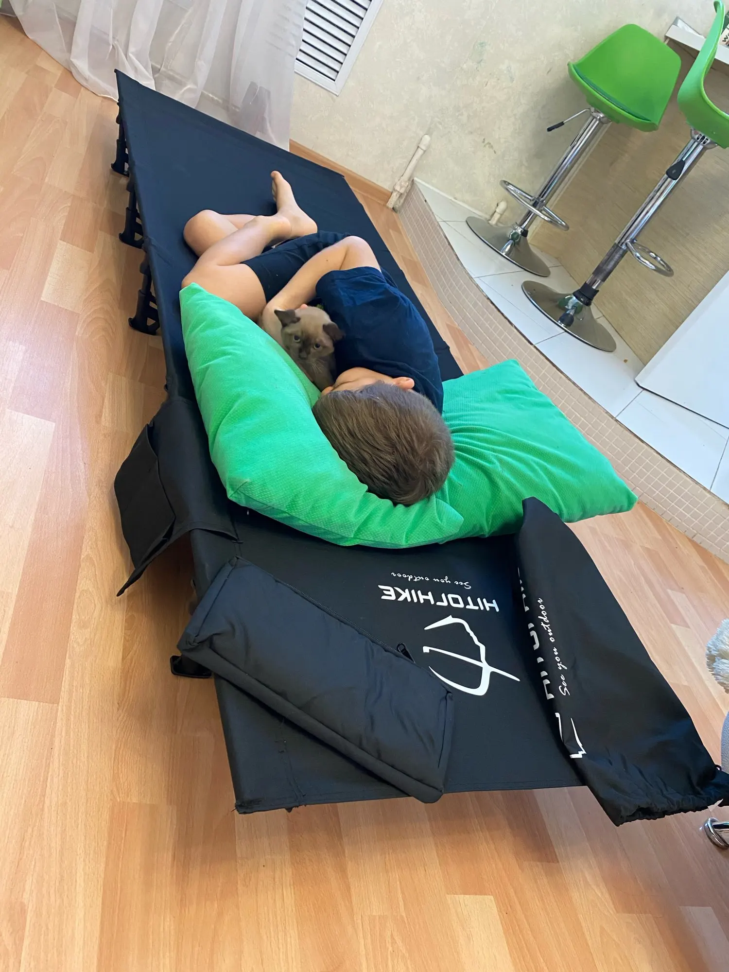 Ауенная раскладушка! Легкая, прочная, собирается легко. Вес 120кг выдерживает спокойной. Кто не понял как собирать и сгибать поперечины, если положить одной стороной раскладушку на пол, и чуть надавить на перекладину, то она легко сгибается и вставляется на свое место. Не понял только для чего две петельки по углам у головной части, одну уже оторвал)) А так ткань прочная, посмотрим как проявит себя в походных условиях. Закажу себе ещё одну. Эта пришла быстро.