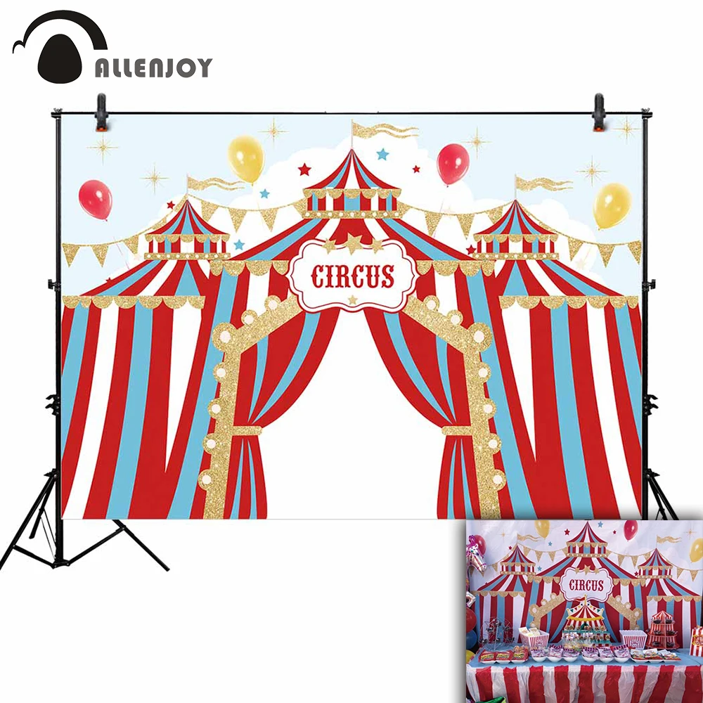 Allenjoy на день рождения фон с изображением цирка вечерние золотые флаги синего и красного цвета в полоску для детей, воздушный шар звезды фоновая фотография баннер для фотосессии