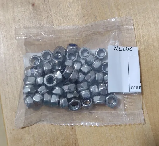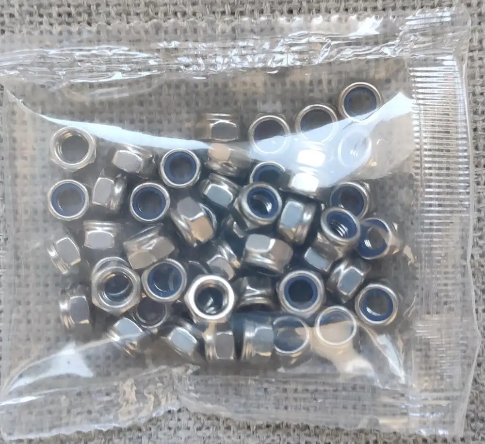 Пришли в небольшом пластиковом контейнере, с перегородками. Вроде, вполне хорошие самоконтрящиеся гайки. Навернул, держатся плотно. Дальше время покажет.