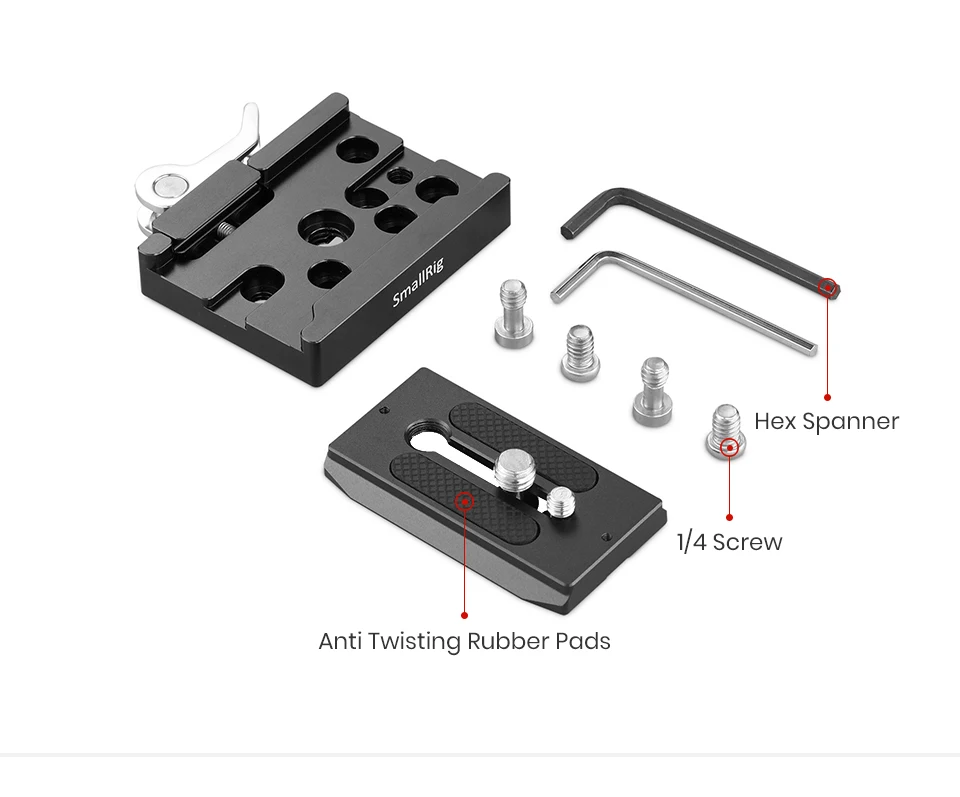 Быстроразъемный зажим SmallRig и пластина (Совместимость с Arca-type) 2144Включает зажим типа Arca и пластину. Герметичность зажима может регулироваться путем перемешивания крошечного винта на рычаге, поэтому он также совместим с большинством пластин типа Arca. Пластина прикрепляется к нижней части камер или клеток винтом (ами). Зажим имеет несколько резьбовых отверстий 1/4 ''-20, 3/8''-16 и тщательные монтажные отверстия на дне, так что вы можете установить его на штативы, Лобзики и другие устройства.