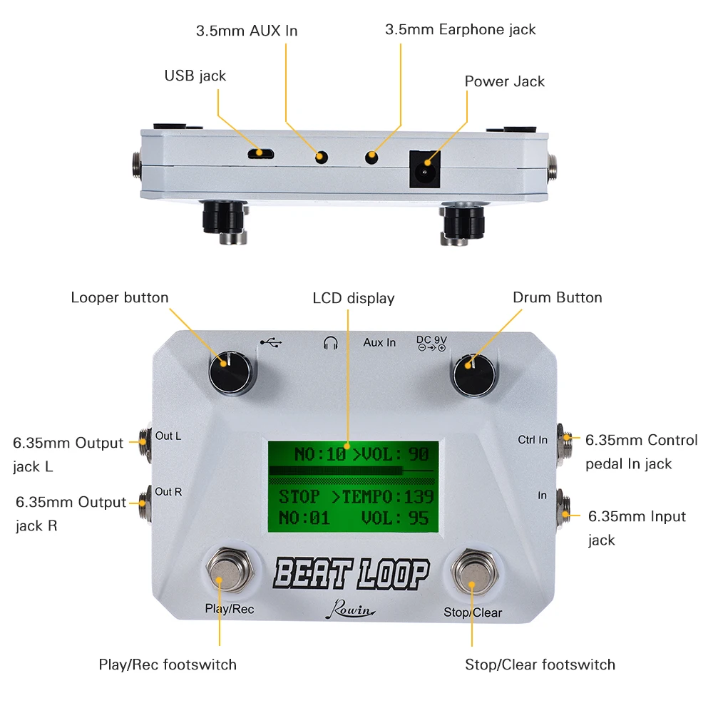 Особенности: Может хранить 30 сучкорезы и общее время записи составляет до 50 минут (каждый Лупер не может превышать 5 минут). С Play/Rec ножная педаль для Лупер запись/воспроизведение/overdub/отмена/Повтор и стоп/прозрачный ножная педаль для остановки в Лупер или очистки записи данных. Встроенный 40 видов барабаны: 1-20 барабаны являются стандартными барабан, а также 21-40 барабаны электронный барабан. Поддержка синхронных режим (петлитель & барабан будет включение/выключение с одной кнопкой стоп одновременно) и асинхронный режим (включение/выключение с одной кнопкой остановки Лупер и барабан таймером задержки отключения будет поддерживаться входит в комплект поставки). 1/4 «Ctrl в разъем для подключения внешних управления для езды на велосипеде, а также поддерживает два-педаль для того чтобы контролировать заполнения, INTR и заканчивая. (педаль приобретается отдельно) С 1/4 "Out L & R для подключения усилителя и 1/4" в гнездо для подключения гитары, а также 3,5 мм стерео выход для наушников Джек и 3,5 мм разъему Aux In. С гнездом USB, поддерживает обновления системы звука барабана обновления, аудиофайла import & export co., ltd (только в том случае, поддержка avi формате файл) и USB аудио устройство записи и воспроизведения. С 128*64 dot большой ЖК-дисплей с отображением работы информацию, чтобы вы могли контролировать для езды на велосипеде более точно. Технические характеристики: Формат хранения файлов WAV, подойдет как для повседневной носки, так, 48K-24bit для отбора проб Звук динамика: 105db Для хранения Количество: 30 сучкорезы, Макс. 50 минут Источник питания: постоянный ток 9V адаптер питания (не входит в комплект) Рабочий ток: 110mA Входное сопротивление (вход): 1mом Выходное сопротивление (Out L & R): 100 Ом Размер товара: 12,5*9*2 см/4,9*3,5 * 0.8in Вес товара: 485g/17,1 oz Примечание: Адаптер питания не входит в комплект поставки. Пожалуйста, используйте адаптер питания DC 9V, полярность которого-положительный полюс снаружи и отрицательный полюс внутри. В противном случае изделие может работать неправильно. Вам нужно скачать и установить относительной программное обеспечение, прежде чем вы подключения для езды на велосипеде к порту USB к компьютеру для обновления системы или звуки барабана. Пожалуйста, найдите загрузки веб-сайта ниже: Для Windows: http:/124.232.142.43:8998/LooperSuite/LooperSuite.exe Для Mac: http:/124.232.142.43:8998/LooperSuite/LooperSuite.zip В комплект входит: 1 * педаль эффектов 1 * USB кабель