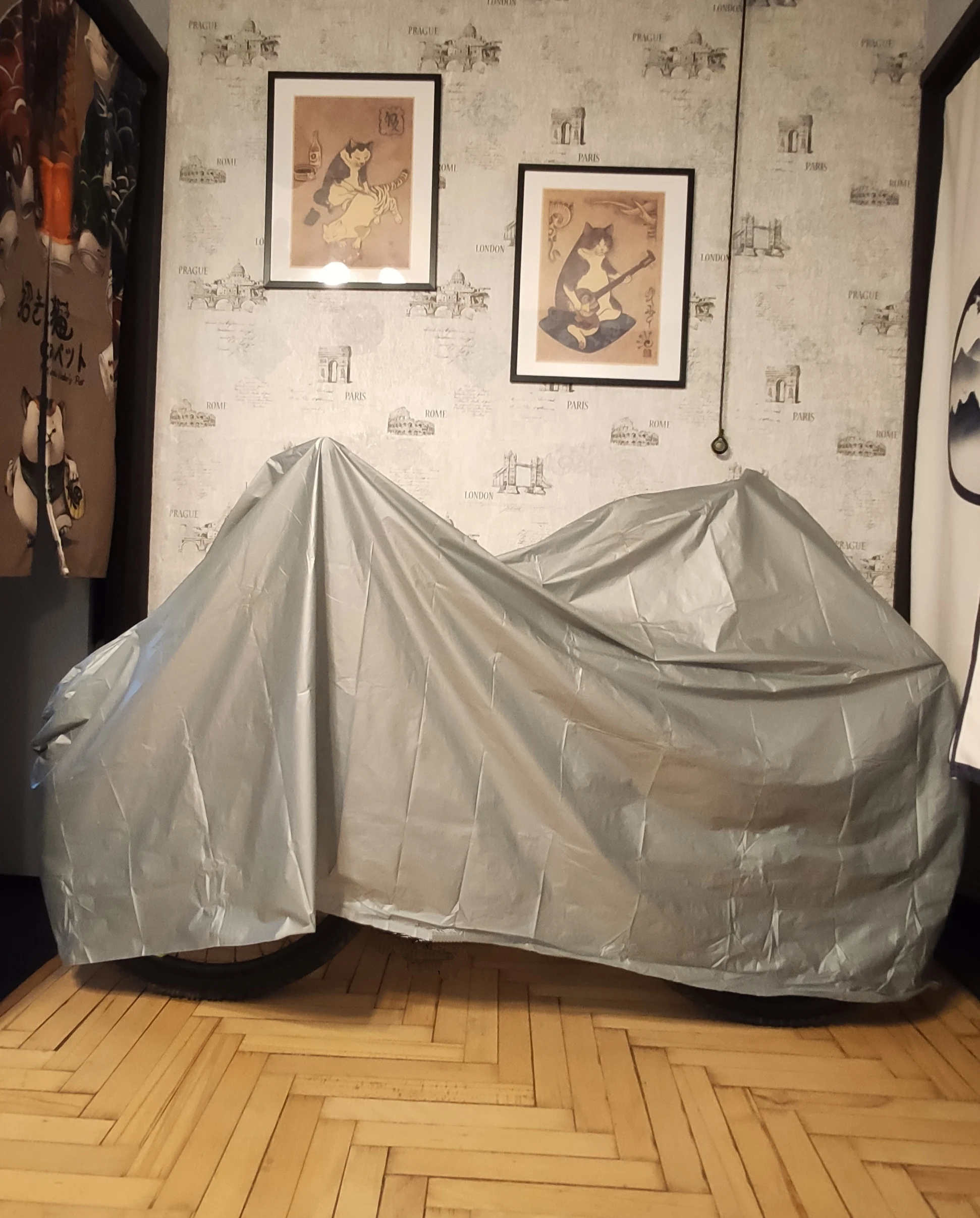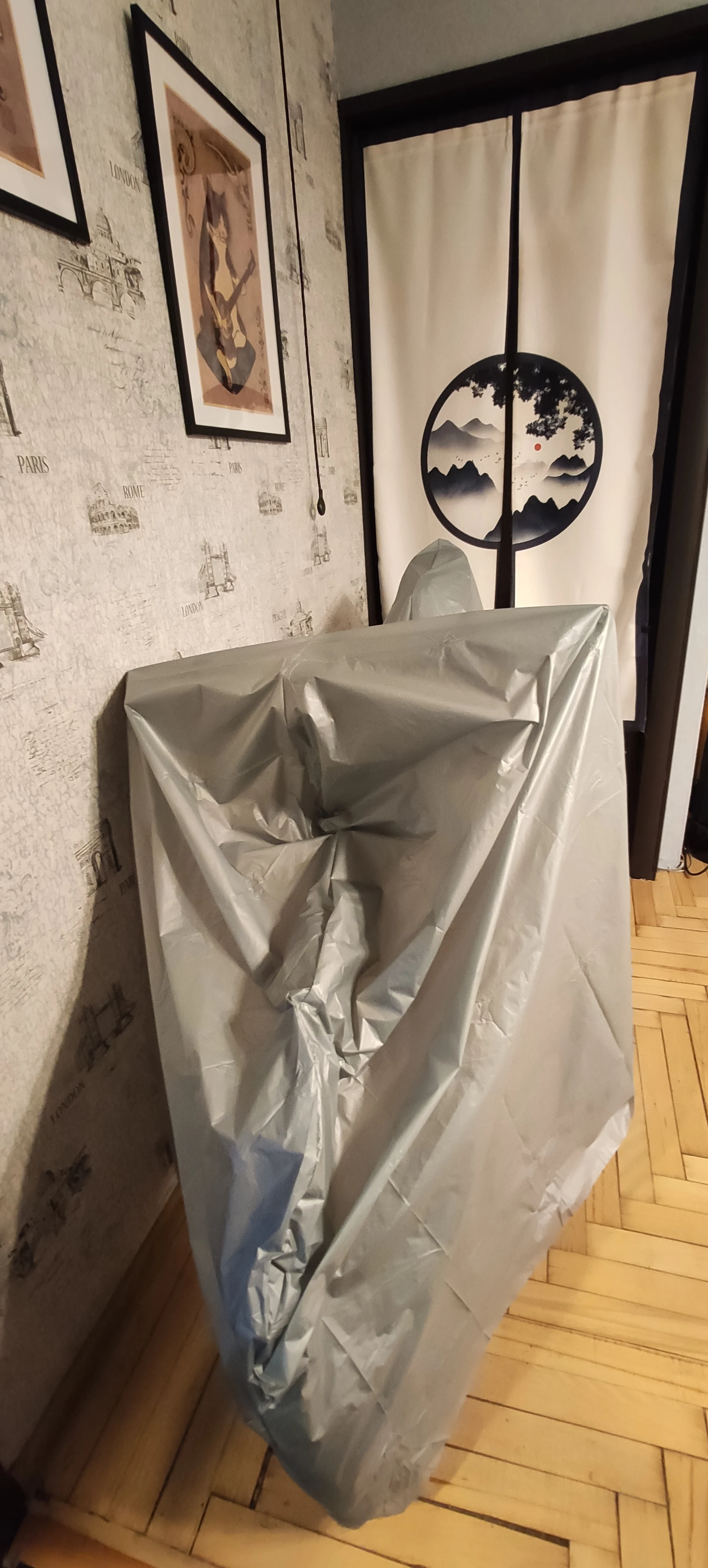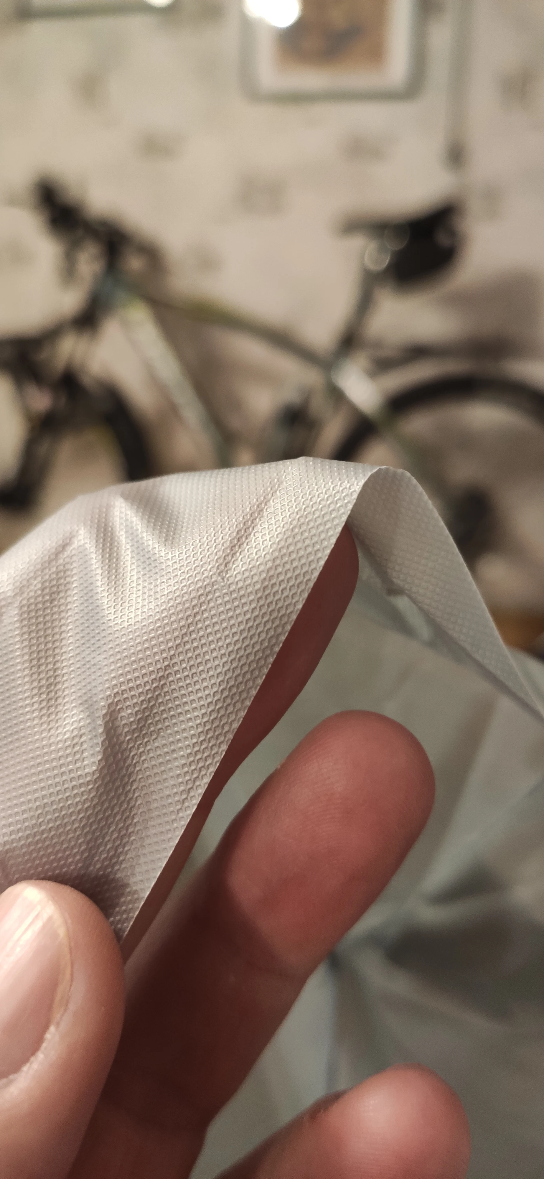 За свои деньги чехол хороший. Материал - гибкий пластик, вроде того, из которого делают шторы в ванной. Тонкий, но не слишком. Для уличных условий с порывами ветра я бы не рекомендовал. К тому же никаких стяжек по нижней кромке нет. Для хранения в крытых помещениях, как защита от солнца и пыли - идеален. Размер "L" отлично подошёл для велосипеда большой ростовки с колёсами 29". В целом товаром доволен и могу рекомендовать к покупке.