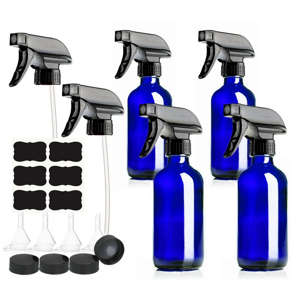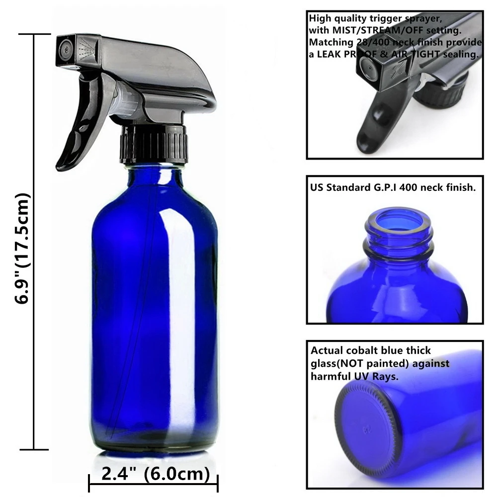 Супер набор из 4 прочных, многоразового использования, 8 унций стеклянных распылительных бутылок разработан со специализированным синим стеклом для максимального проникновения солнца для создания солнечной воды.