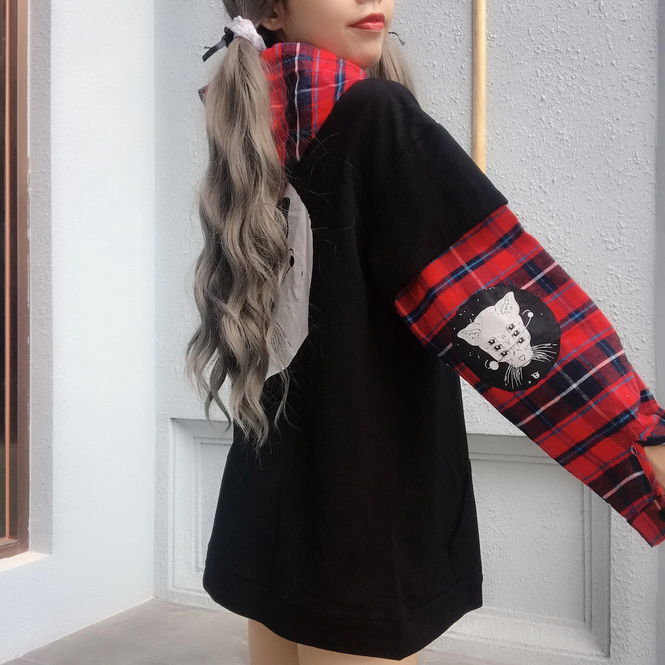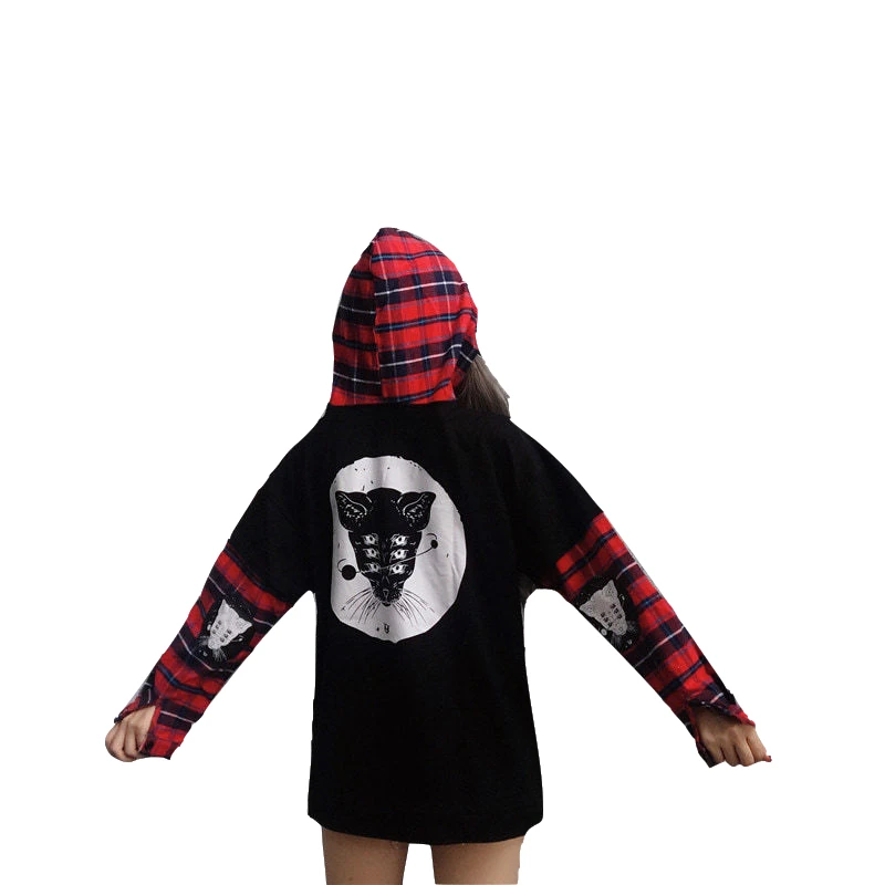 Женская толстовка с капюшоном, черная винтажная толстовка с капюшоном, в стиле Kpop, в стиле Харадзюку, с принтом кота, в стиле аниме, для девочек-подростков
