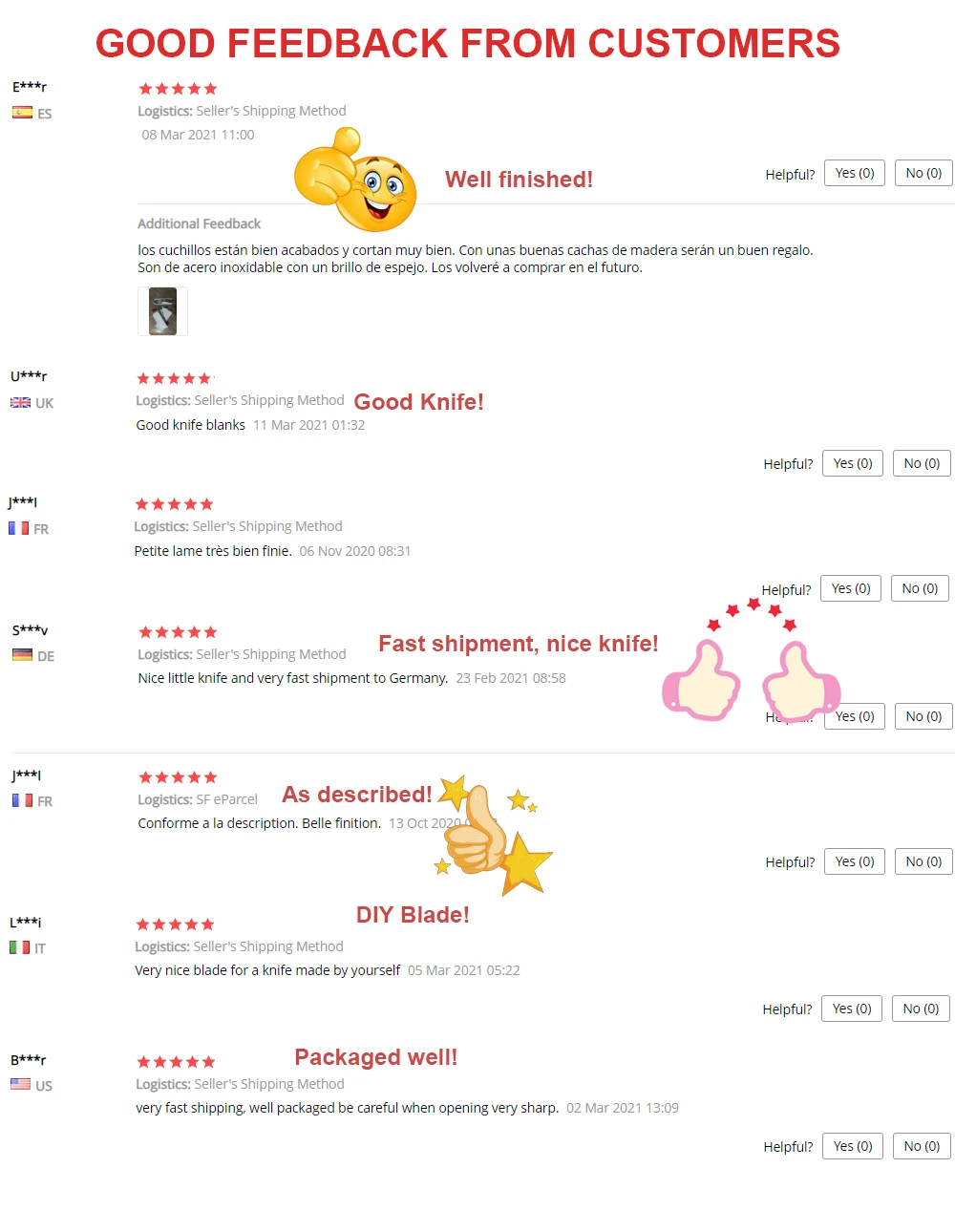 Excellent! Well packed, very well finished and sharp blade blanks. Perfect to make a neck or pocket knife as gifts for friends.