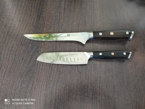 Заказал два ножа. Продавец длительное время не отправлял товар. После отправки не удавалось отследить. Поэтому пришли неожиданно. Думал придется открывать спор. Ножи упаковыны очень достойно. Кончик ножа защищен специальным пласмассовым уголком. Проверил оба ножа при приготовлении колбасы, а именно подготовки мяса к засолке, обрезка жилок, жира, нарезка. Идеально ! так же нарезал замороженное сало кусочками 5мм. -без проблем. Единственное через час, перчатка окрасилась от ручки. Сегодня готовил скумбрию для копчения, доволен. Теперь посмотрим, солько будет держать заточку...)