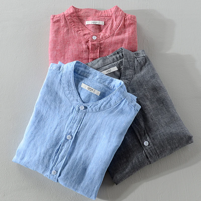 Рубашка Мужская льняная с воротником-стойкой, дизайнерская дышащая сорочка с коротким рукавом, однотонная кораллово-красная топ, рубашка