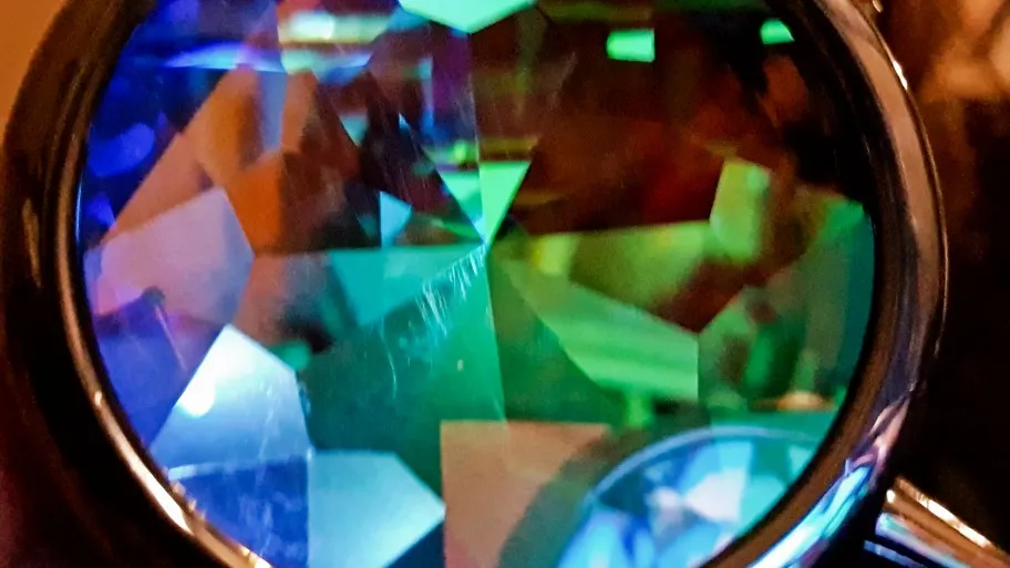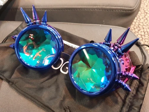Эти очки фантастические и веселые. Гуглы хорошо сидят на мне даже на большом носу, благодаря гибкому стержню между линзами. Разноцветная металлическая поверхность оправы выглядит очень стильно. Калейдоскопические линзы очень веселые, и все в вашем поле зрения становится хрупким, размножающимся и искаженным. Вам будет сложно сориентироваться в комнате, но это может быть сделано. Ближе всего я был к тому, как это должно быть муха с 1000 глазами.