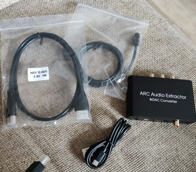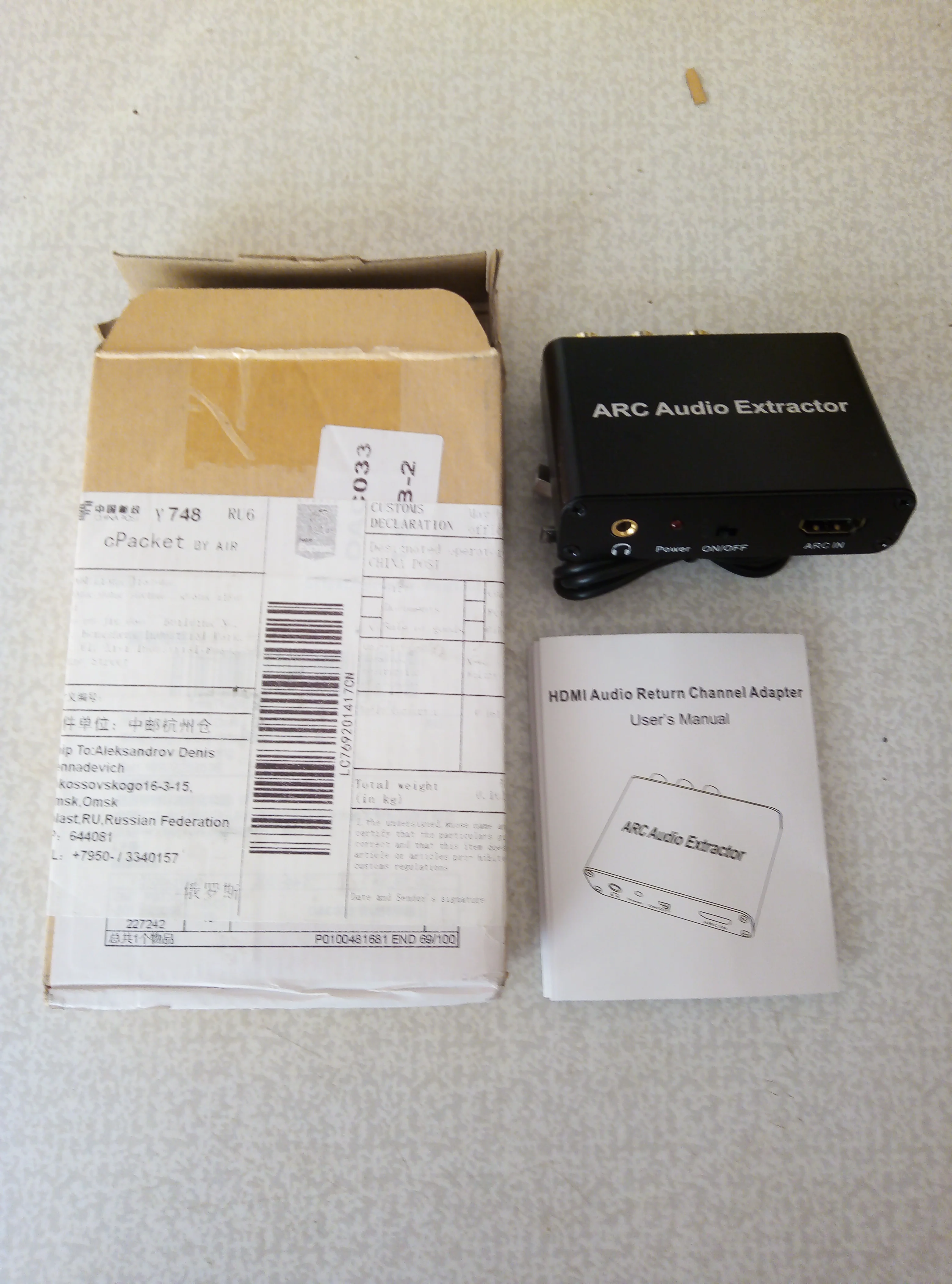 за месяц дошло в Полоцк, упаковано надежно. Комплект полный - сам адаптер, кабель питания, HDMI и оптика. HDMI подлючил к гнезду HDMI-eARC на телике, кабель питания тоже в телик, в гнездо USB. От адаптера тюльпанами на колонки. Всё сразу заработало, телик сам переключился с динамиков на HDMI адаптер. Громкость с пульта от телика регулируется. Фонового шума нет, всё работает отлично.