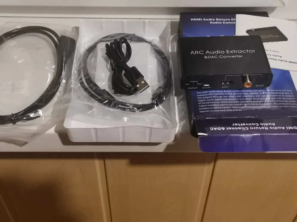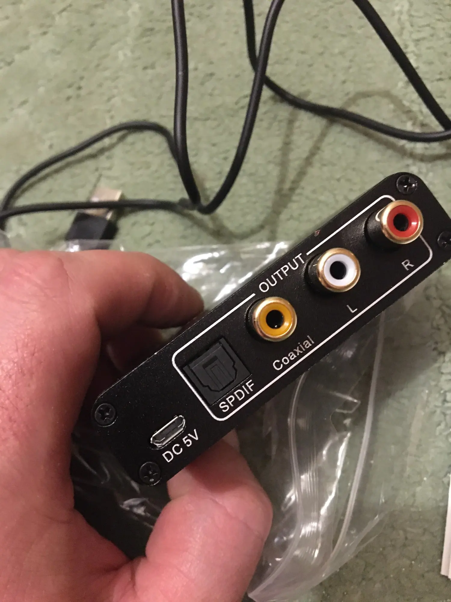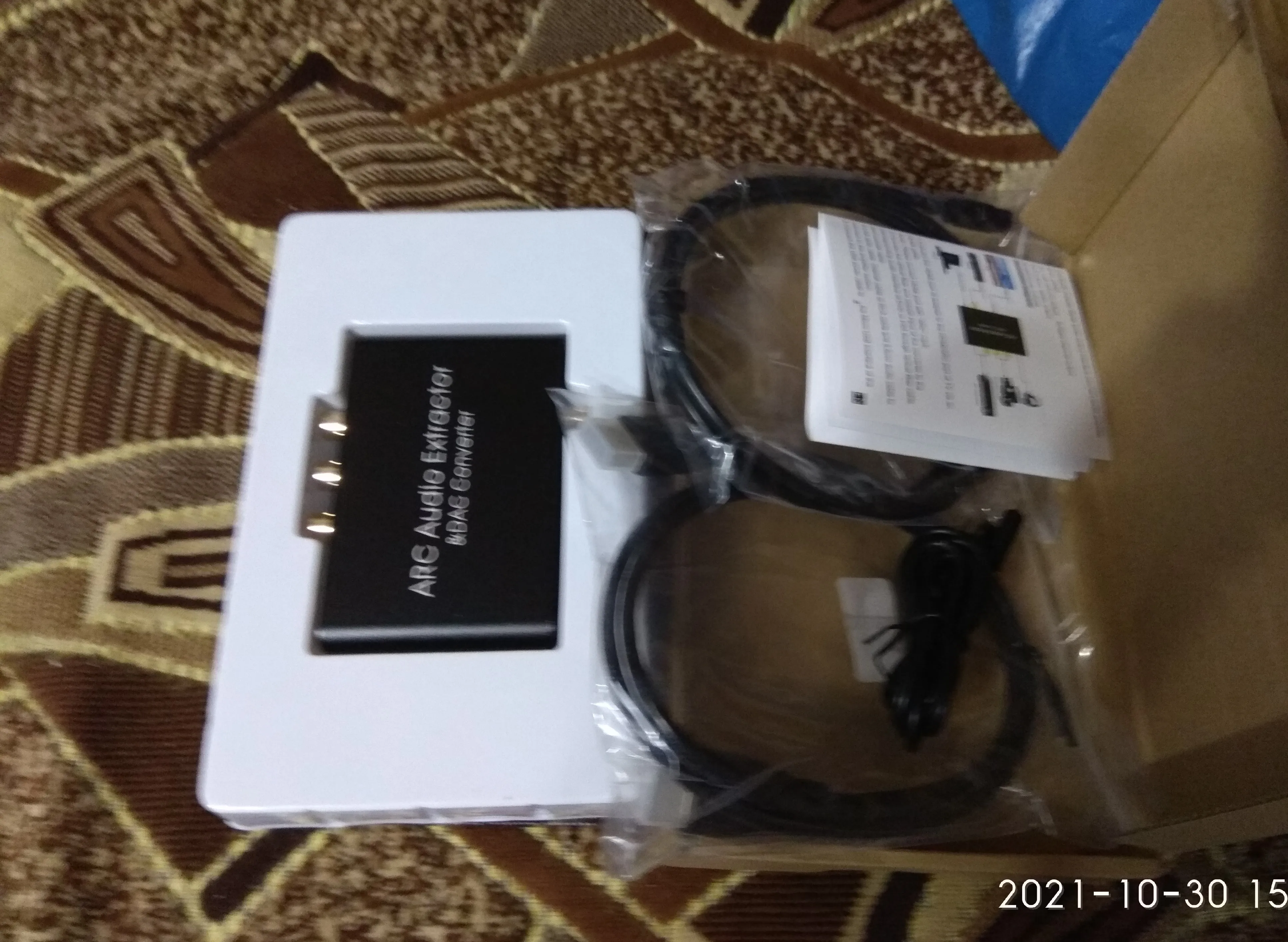 Устройство работает хорошо и без танцев с бубнами, Звук со смарт ТВ теперь идет через старый добрый аналоговый усилитель, в комплекте usb кабель питания, при подаче звука 5.1 нужно на источнике включать PCM и будет хорошее стерео, долгая отправка в следствие чего и долгая доставка, заказывал как подарок должно было прийти 01.12 пришло 04.12 пришлось оставить себе о чем не жалею.