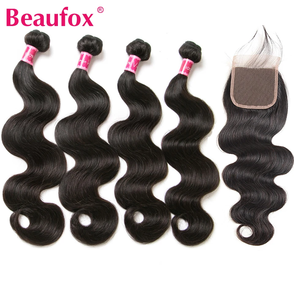 Beaufox объемные волнистые пучки с закрытием, бразильские волосы для плетения, человеческие волосы, пучки с закрытием, Remy 4 пряди с закрытием
